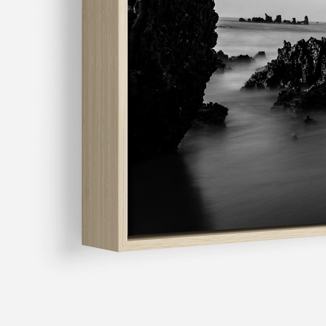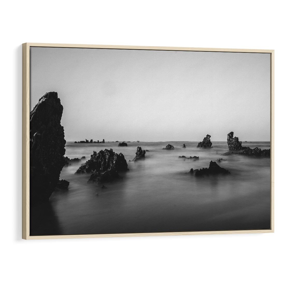 Obraz w ramie 70x50 - Harmonia świateł i cieni - zamglona dzika plaża, skały na plaży - rama drewno