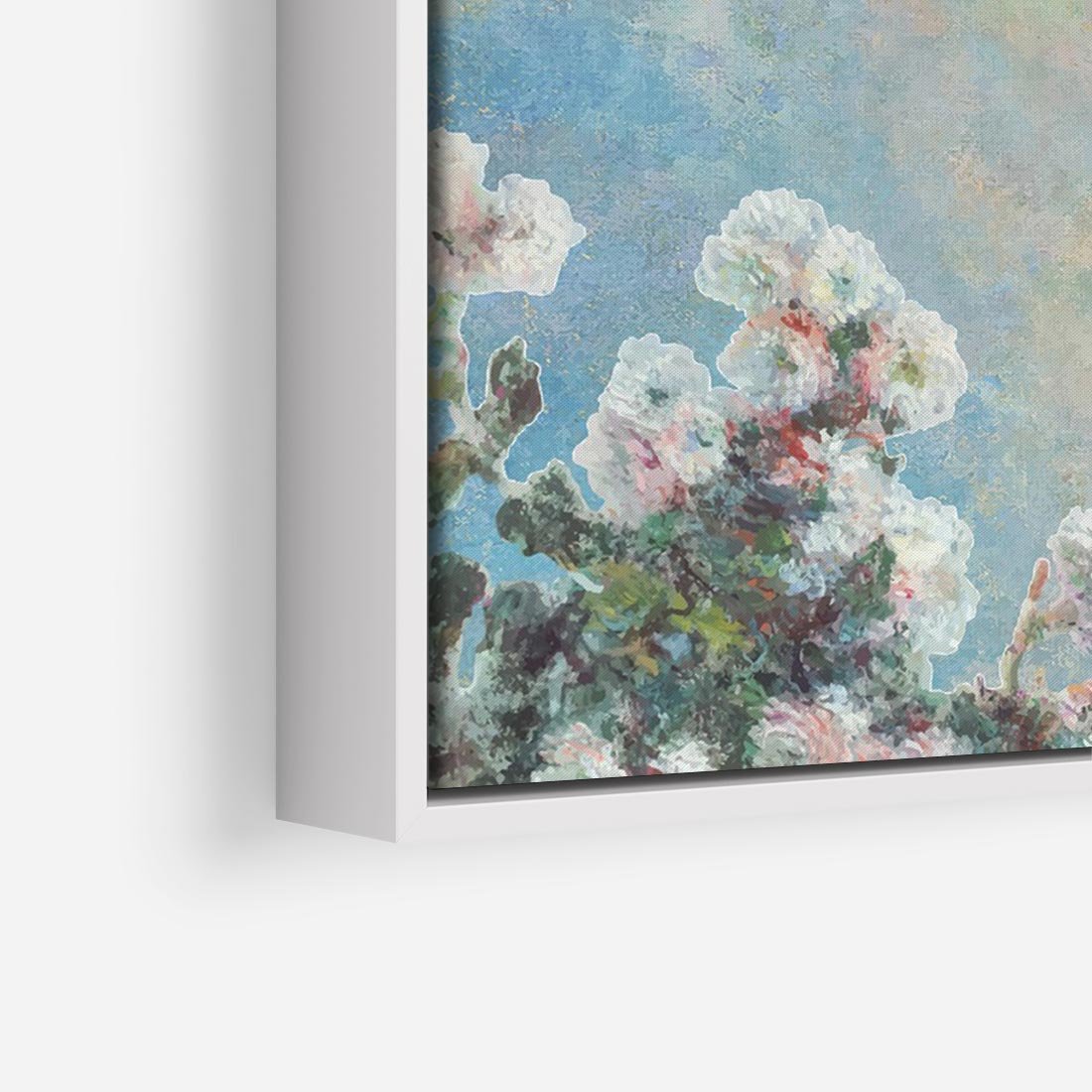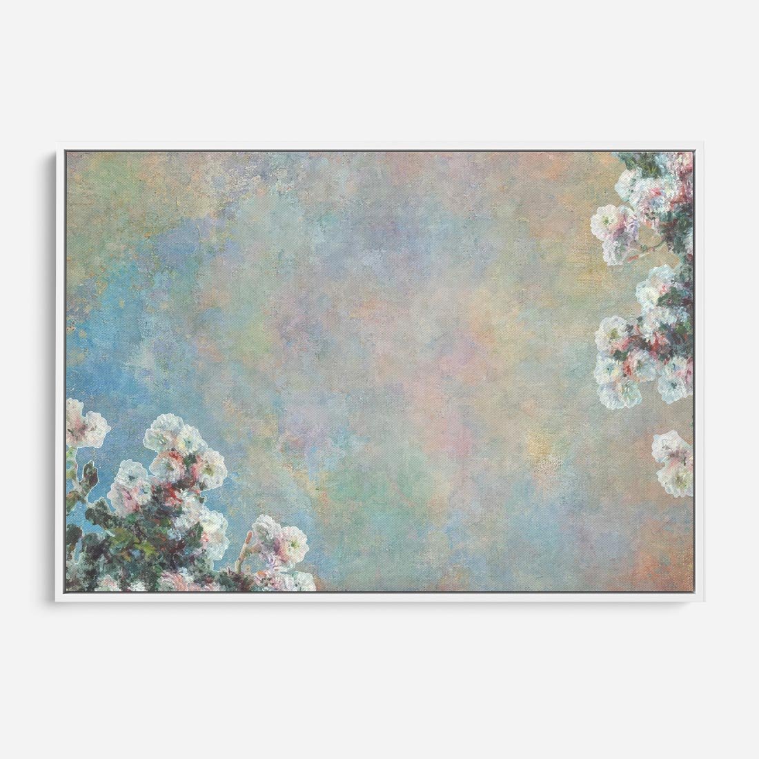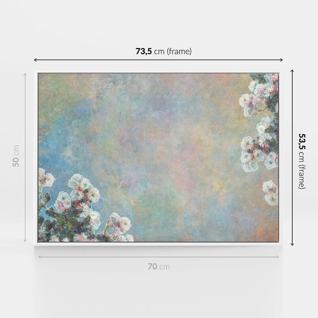 Ten subtelny obraz olejny przedstawia minimalistyczny układ, gdzie kwiaty delikatnie ukazują się w rogach pastelowego tła. To wyraz subtelności i spokoju, gdzie rośliny wiodą nas przez sielski krajobraz natury, pozostawiając główną rolę ich pięknu.