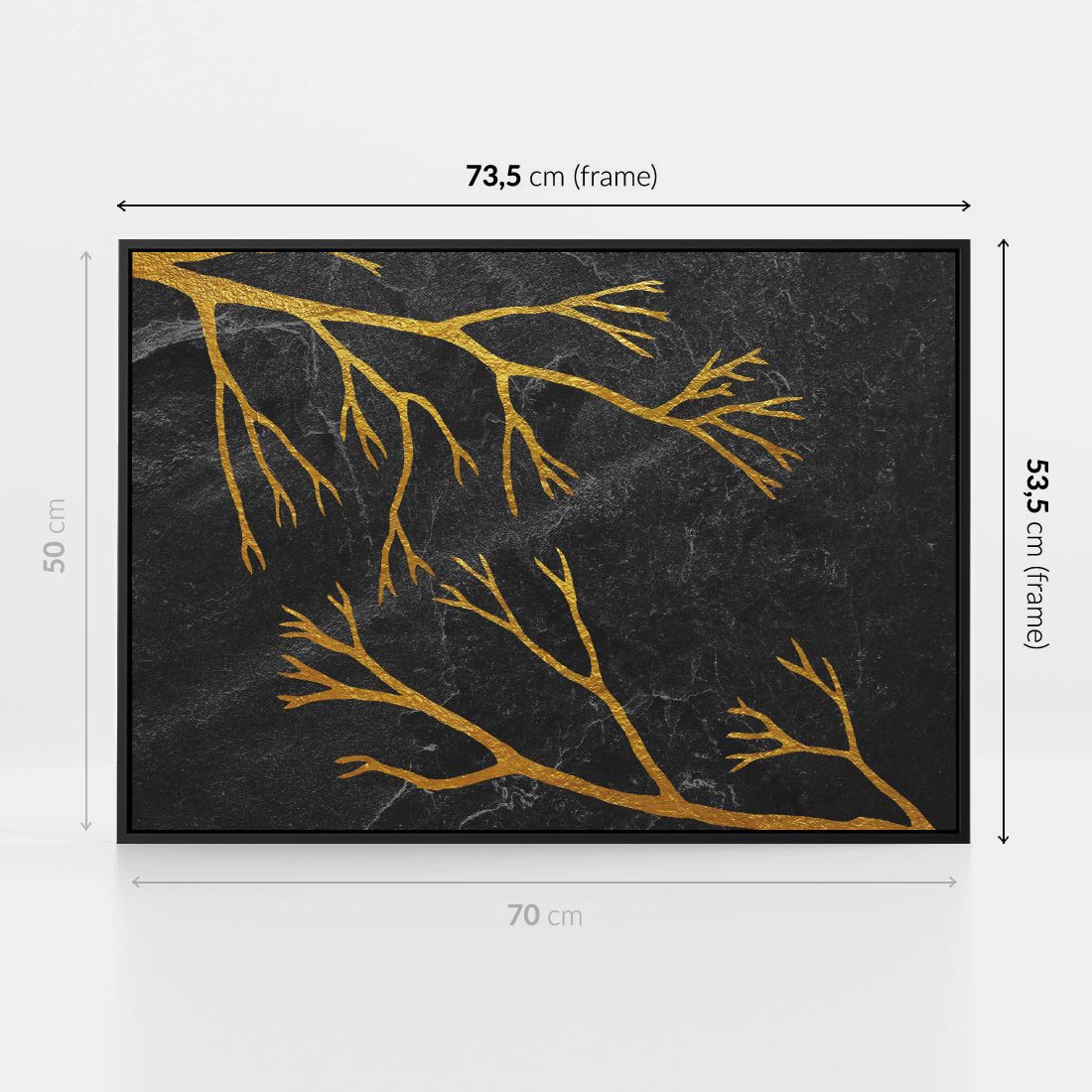 Ten metaforyczny obraz przedstawia złote gałęzie drzew na czarnym marmurowym tle, emanujący elegancją i tajemniczym urokiem. Minimalistyczny design podkreśla wyrafinowany charakter kompozycji. To dzieło sztuki przenosi widza w niezwykłą przestrzeń, gdzie złoto symbolizuje światło i nadzieję w ciemnościach. Idealny dodatek do wnętrz, które pragną zachować wyjątkowy i niezwykły wystrój.
