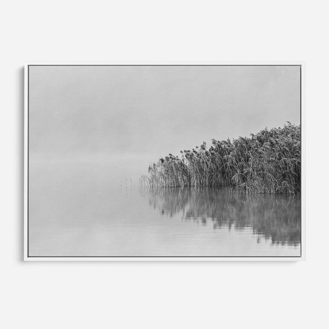 Obraz w ramie 70x50 - Mglisty Brzeg Jeziora - czarno białe zdjęcie, zamglone jezioro - rama biała