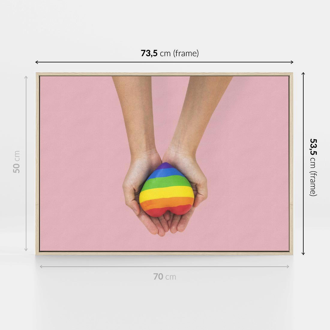 Obraz w ramie 70x50 - Miłość na Dłoniach - zdjęcie, dłonie trzymają ulepione tęczowe serce - rama drewno