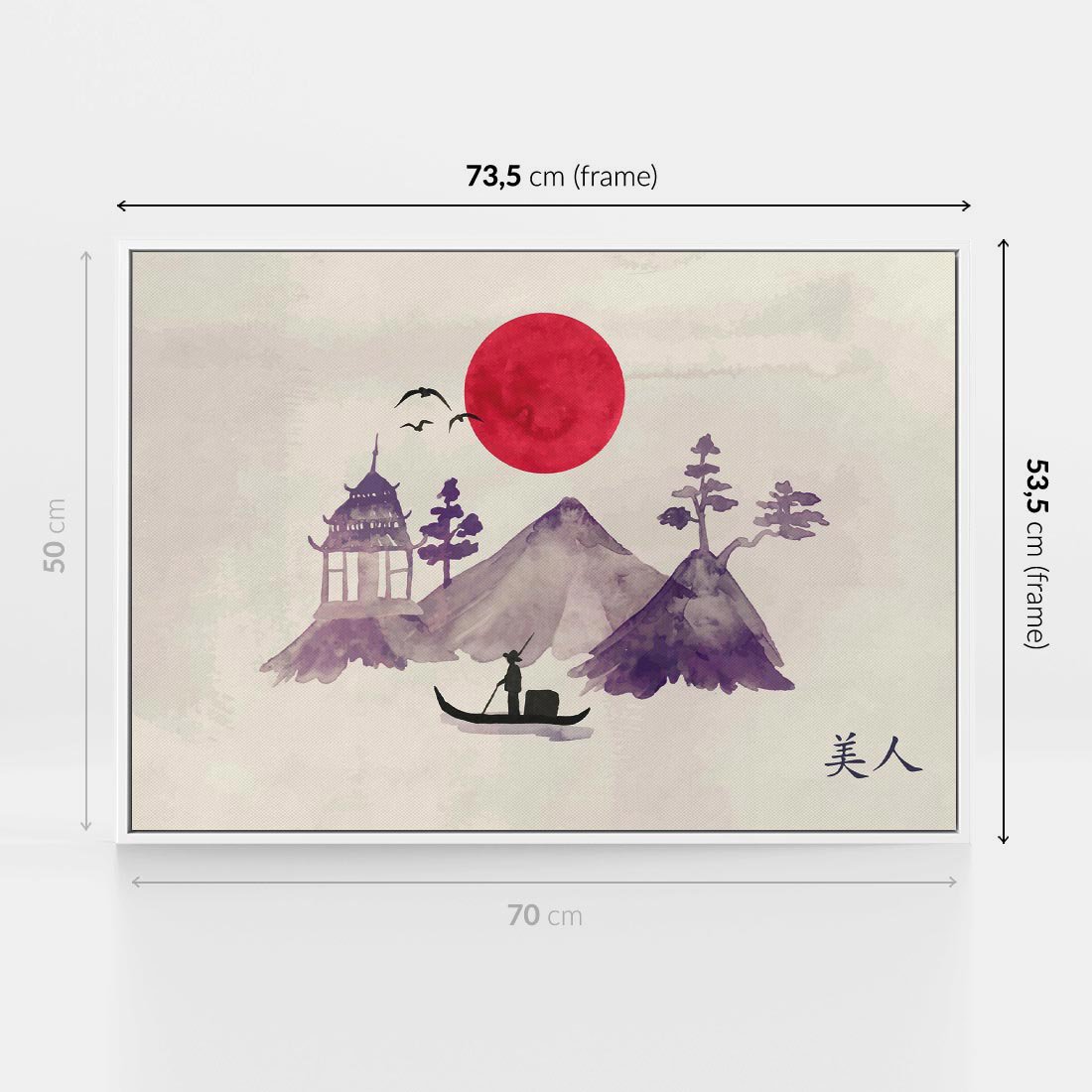 Ta urocza akwarela ukazuje japońską łódź na spokojnym jeziorze, z czerwonym słońcem na horyzoncie. Sztuka emanuje harmonią i spokojem, charakterystycznymi dla japońskiej sztuki. Przenosząc nas w magiczny świat natury, obraz ukazuje urok przyrody i zachodu słońca.