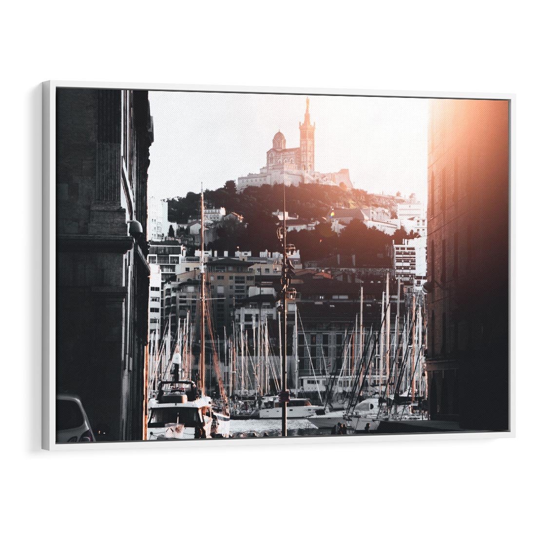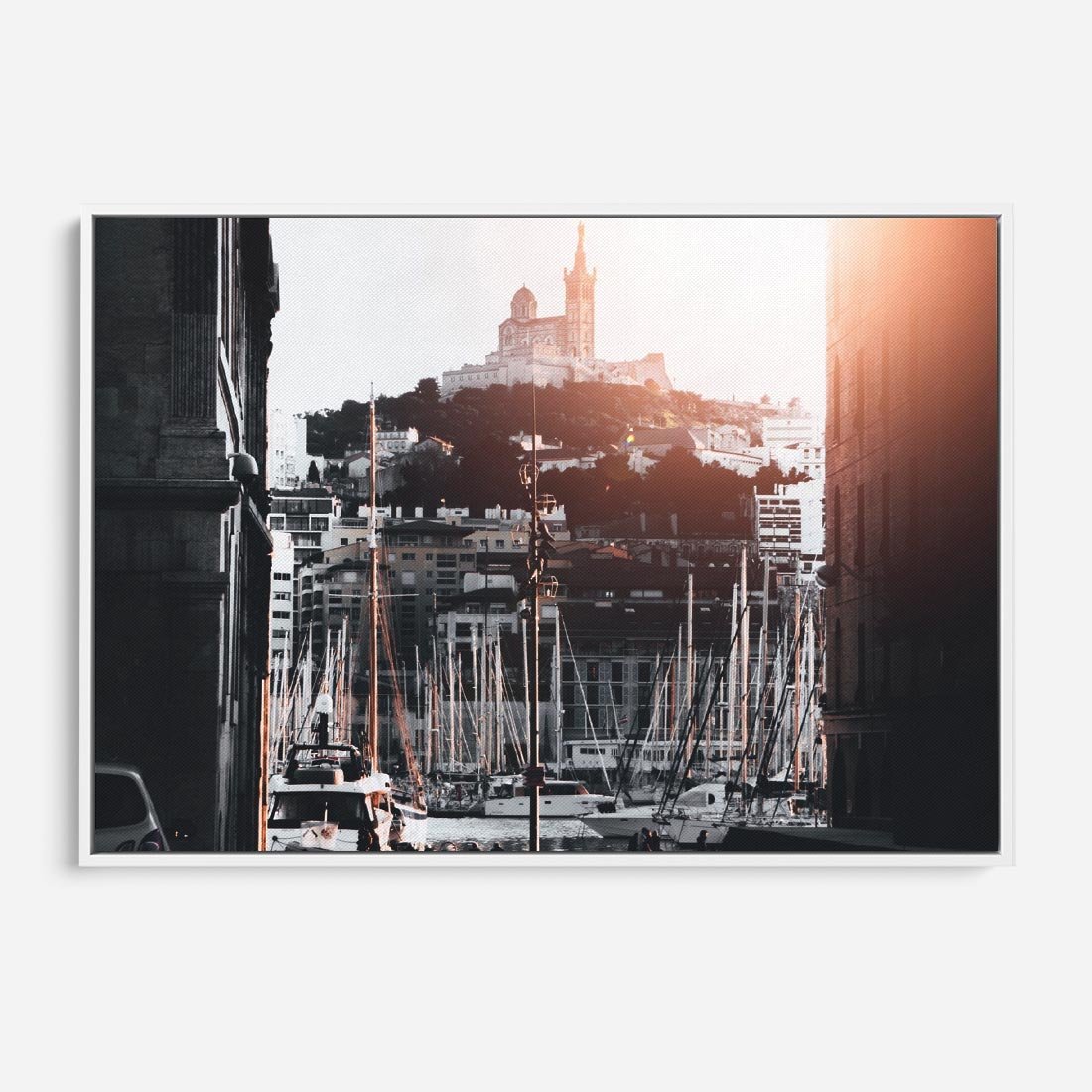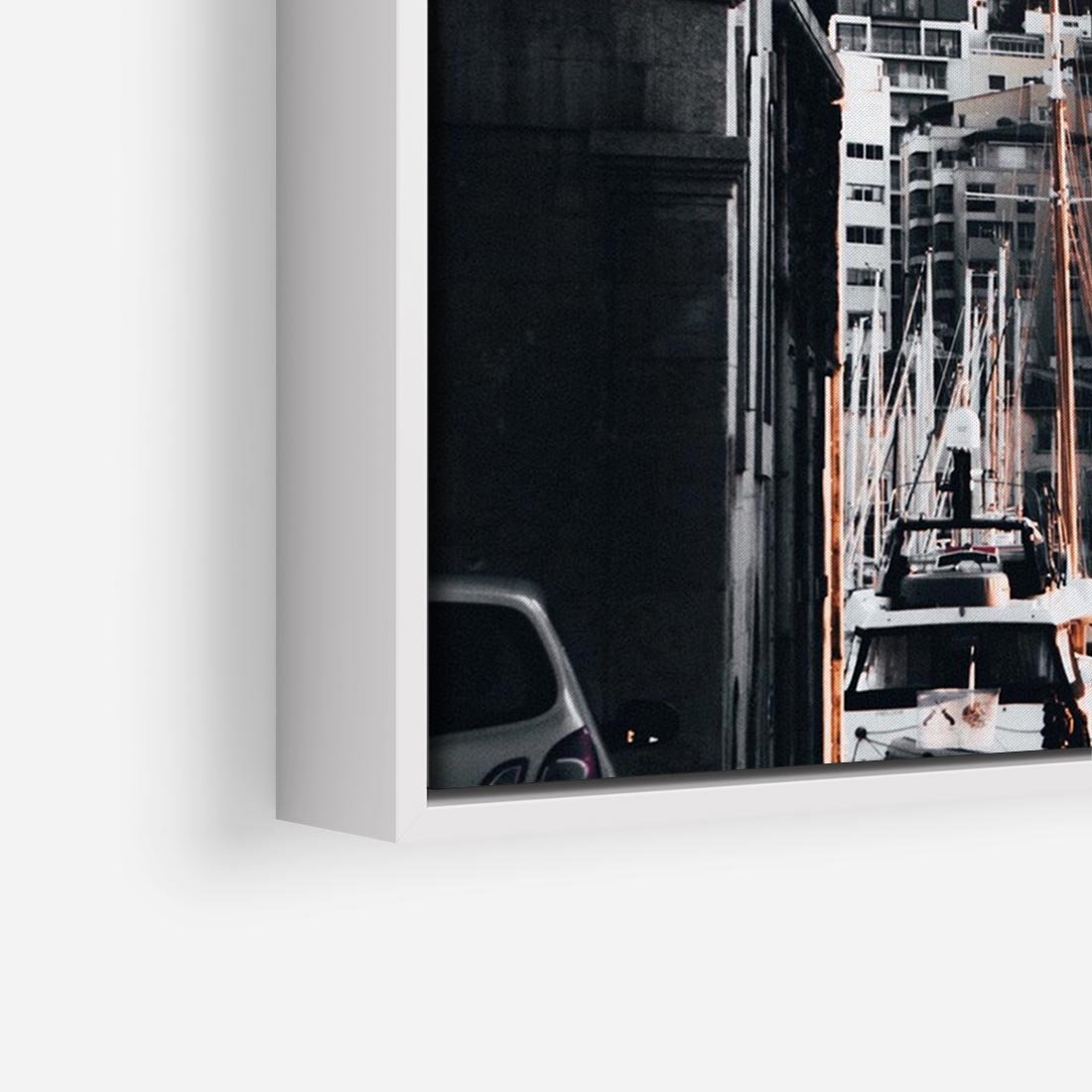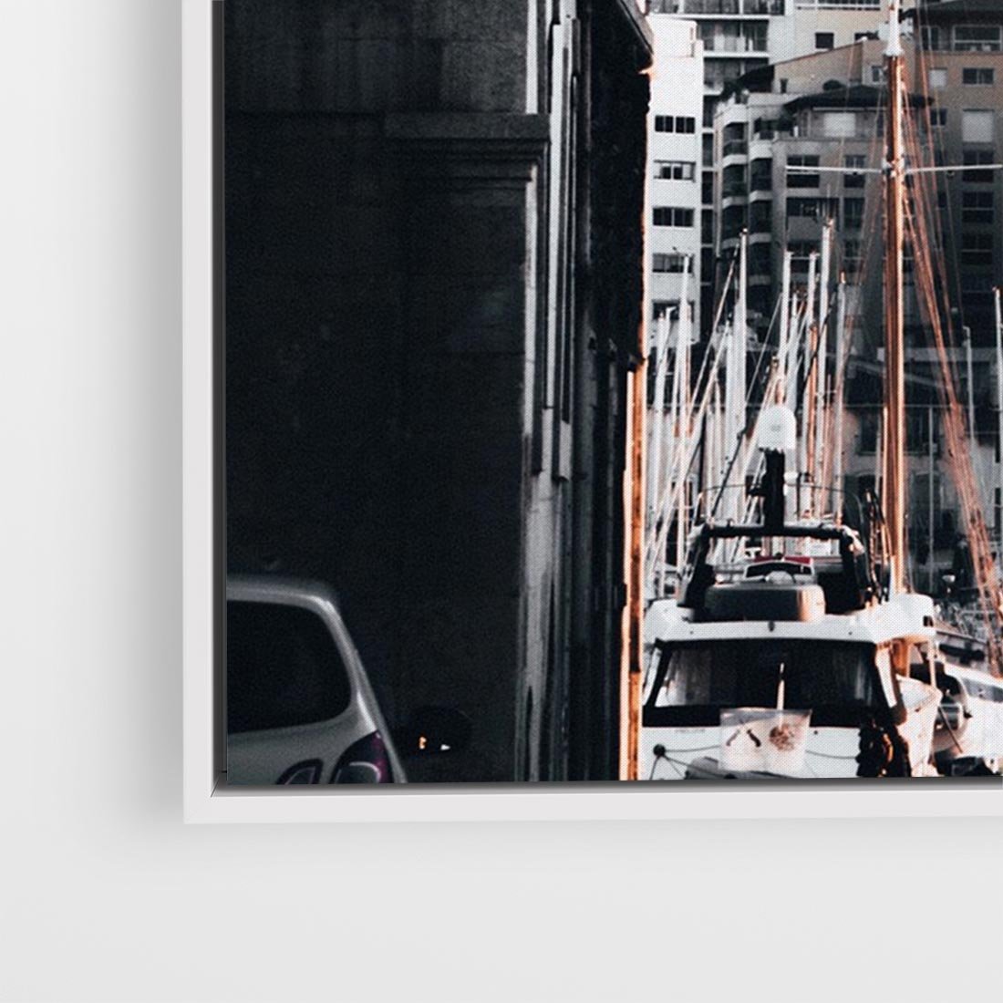 Obraz w ramie 70x50 - Światło Portowe - czarno białe zdjecie, uliczka w nadmorskim mieście - rama biała