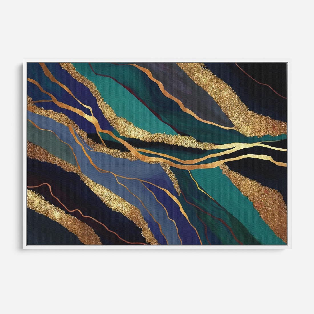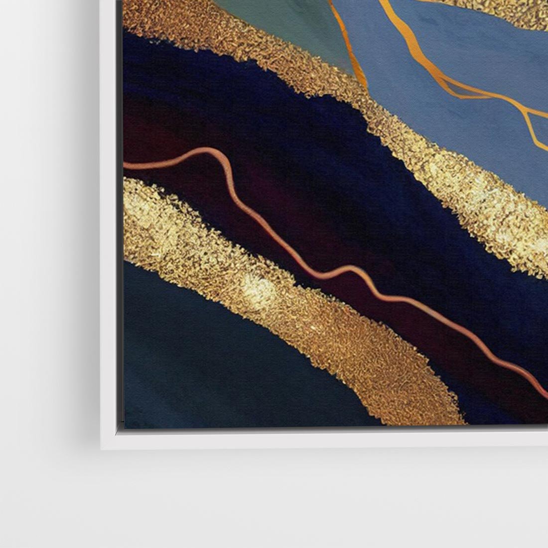 Zachwycaj się abstrakcyjną grafiką inspirowaną marmurem, wzbogaconą o intensywne kolory złota, zieleni i granatu. To wyjątkowe dzieło sztuki, stworzone dla osób ceniących elegancję i nowoczesność. Obraz emanuje luksusowym wdziękiem i będzie doskonałą dekoracją dla miłośników sztuki, pragnących unikalnego akcentu w swoich wnętrzach.
