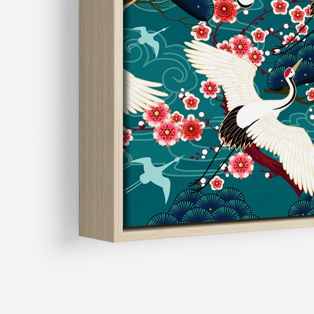 Grafika przedstawia orientalne japońskie żurawie lecące na turkusowym tle, w otoczeniu delikatnych kwiatów wiśni. Kształty wachlarzy dodają kompozycji elegancji. To artystyczne dzieło niesie ze sobą odrobinę dalekich kultur, przynosząc spokój i subtelny urok do wnętrza. Doskonałe do dekoracji w każdej przestrzeni.