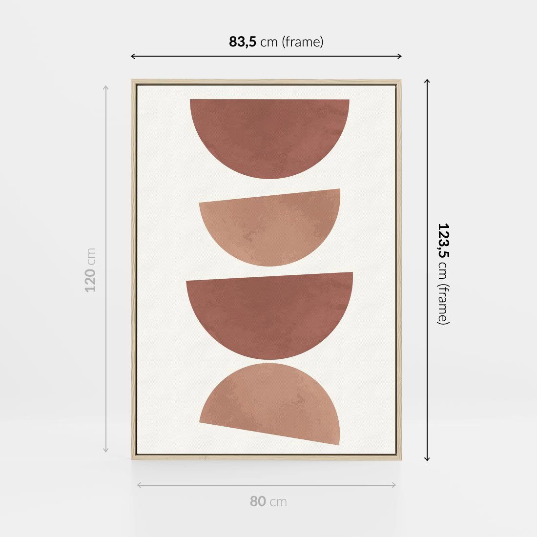 Ten obraz przedstawia abstrakcyjne geometryczne kształty w stonowanych odcieniach brązu i beżu. Doskonale wpasuje się w minimalizm, boho styl i nowoczesne wnętrza.