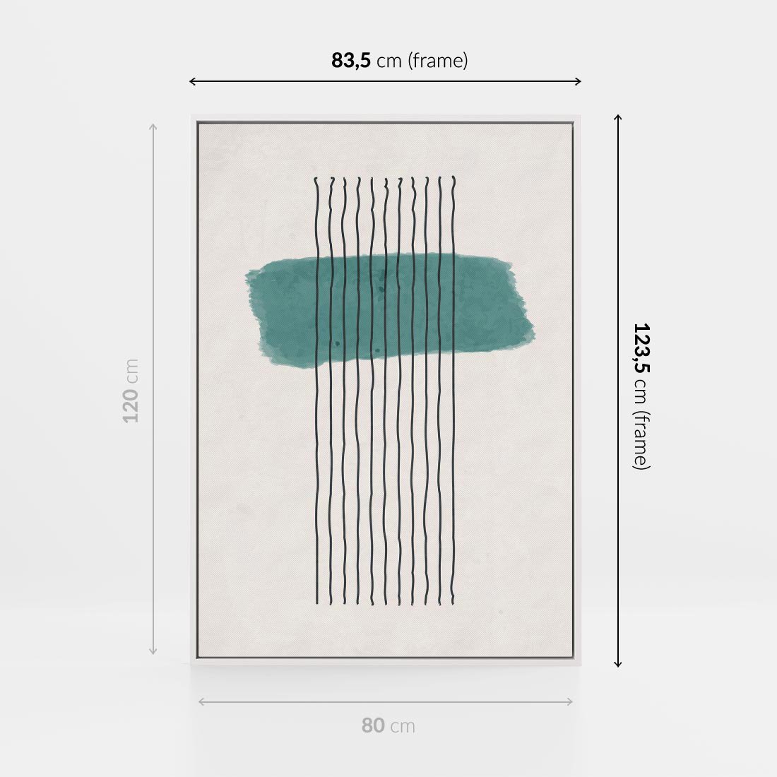 Abstrakcyjna akwarelowa plama w odcieniach turkusu, zdobiąca się nieregularnymi kreskami i dynamicznymi liniami, emanuje minimalistycznym urokiem i wyjątkową energią.