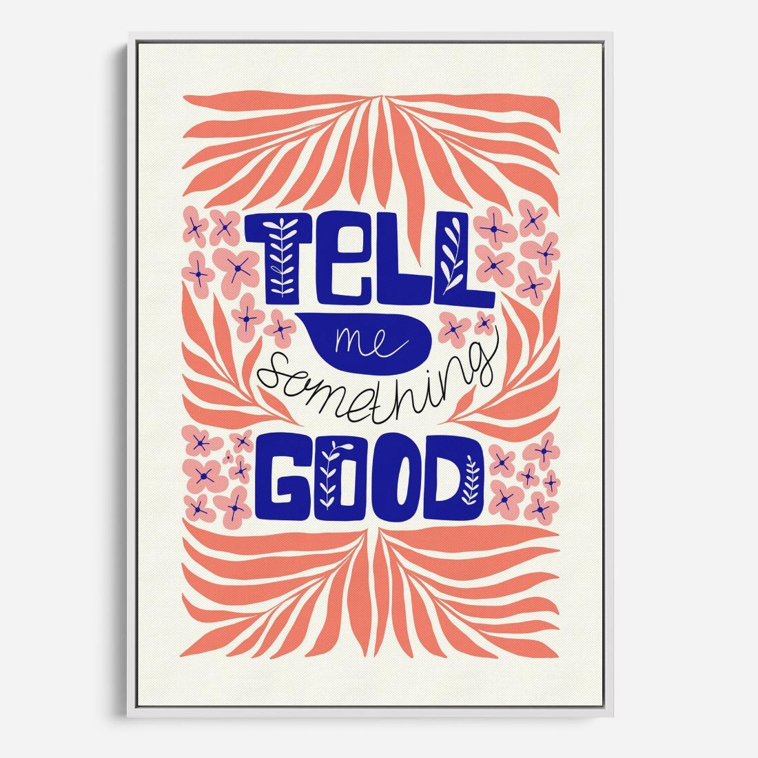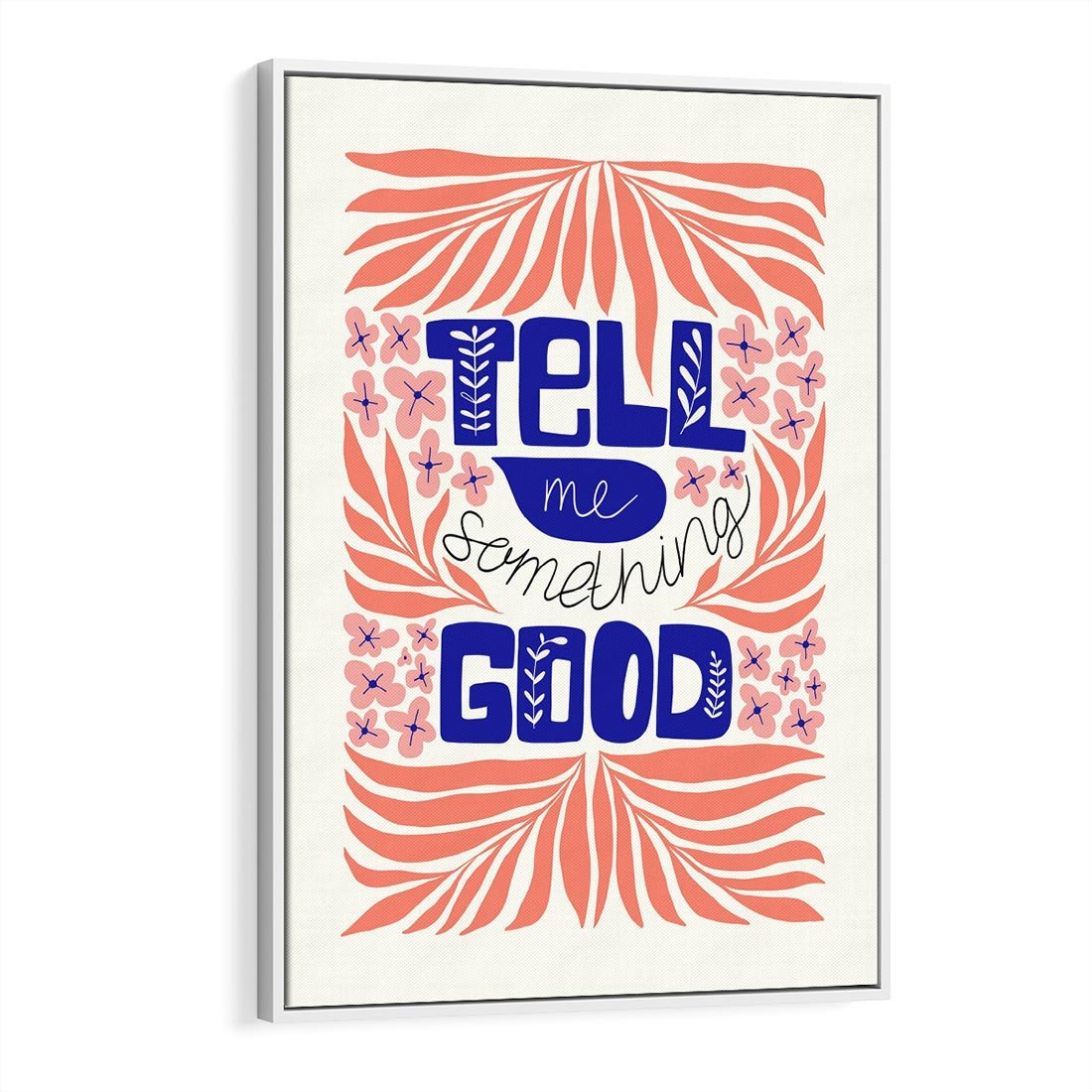 Ta kompozycja łączy liście i kwiaty w nowoczesnej typografii, wykorzystując łososiowy kolor i granatowy akcent. Sztuka ta harmonizuje naturę i słowa, tworząc spokojny i elegancki plakat o unikalnym wyglądzie.