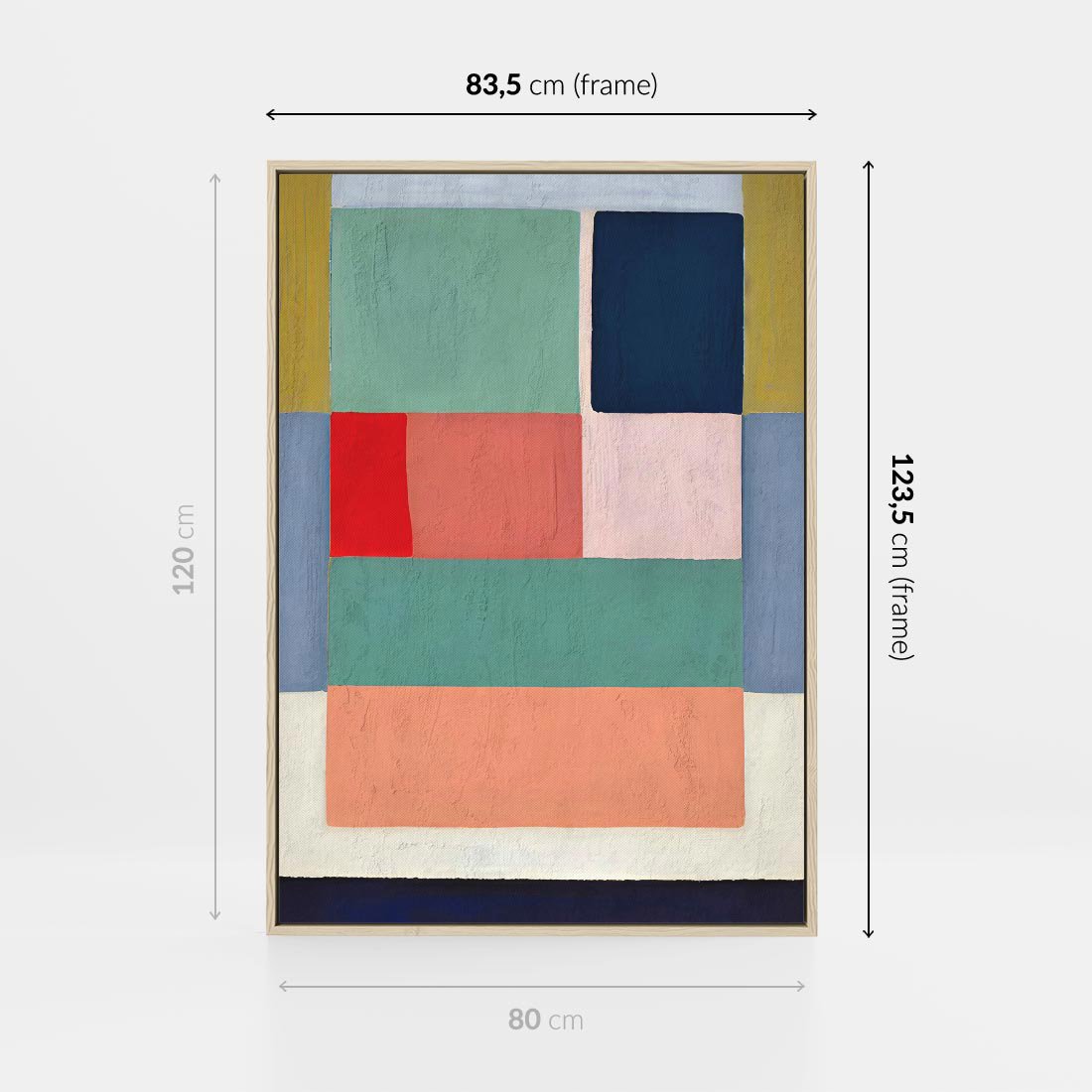 To olejny obraz o abstrakcyjnych geometrycznych kształtach, w których dominują pastelowe kolory. Prostokąty i kwadraty tworzą harmonijną kompozycję, która zachwyca swoją subtelnością i równowagą.