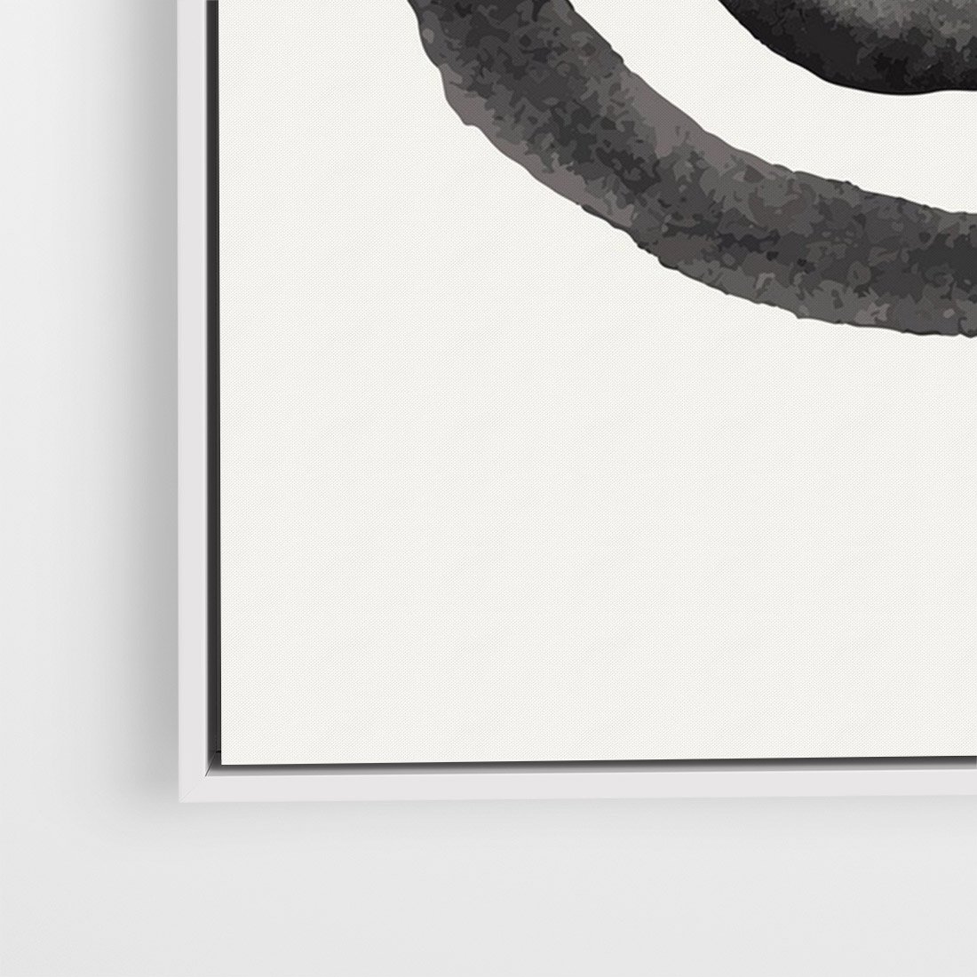 Ten wyjątkowy obraz łączy abstrakcyjne plamy i okręgi w delikatnych odcieniach akwareli. Biało-czarna kolorystyka niesie ze sobą minimalistyczną estetykę, tworząc harmonijną kompozycję.