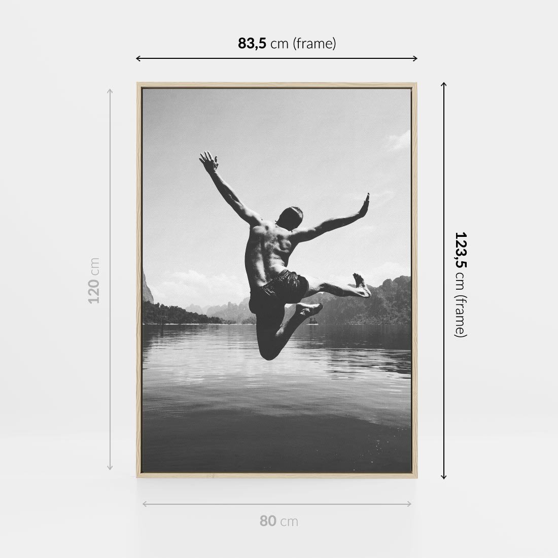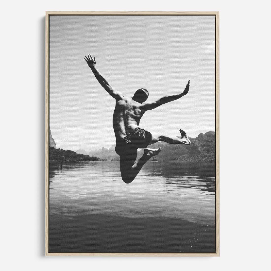Obraz w ramie 80x120 - Beztroska Chwila - czarno biała fotografia, mężczyzna wesoło wskakuje do keziora w górach - rama drewno