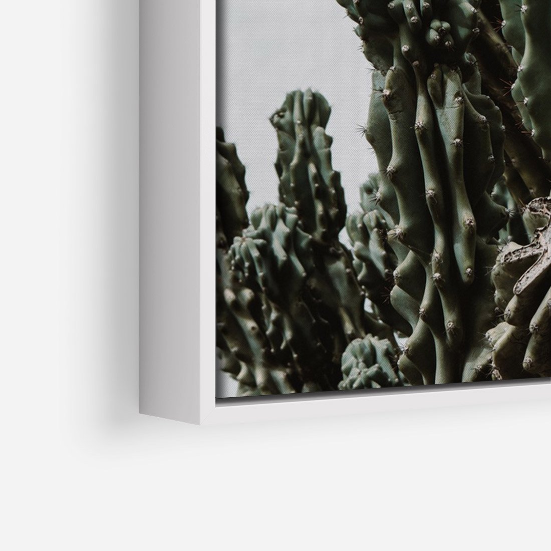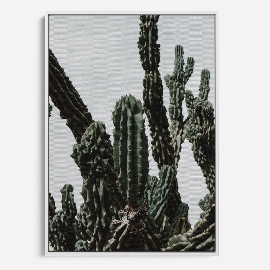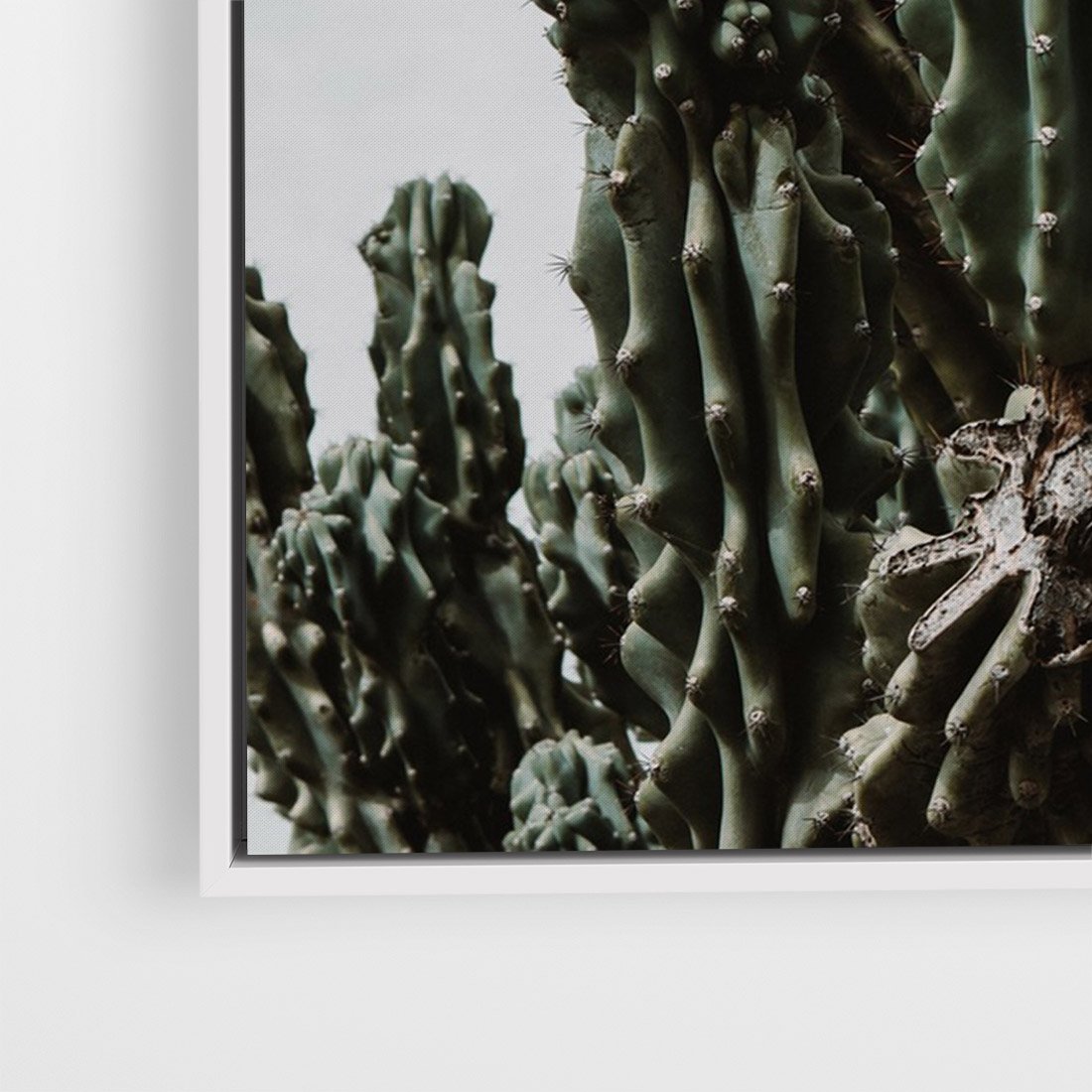 Obraz w ramie 80x120 - Boho oaza wśród kaktusów - kaktusy, pustynia - rama biała