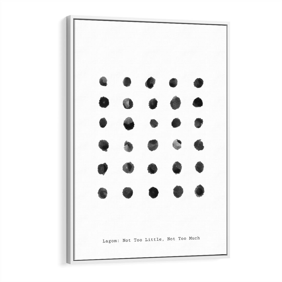 Ten minimalistyczny plakat skupia się na esencji prostoty poprzez czarne kropki na białym tle. Lagom typografia doskonale komponuje się z minimalistycznym wzornictwem, tworząc równowagę i spokój. To dzieło sztuki, które przypomina nam o mądrości w umiarze i pięknie w prostocie.