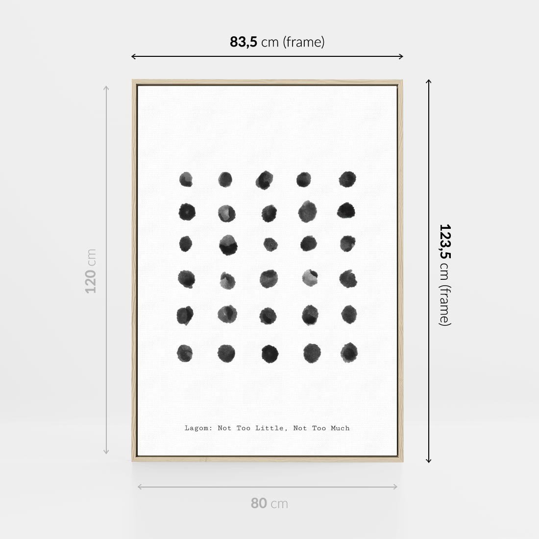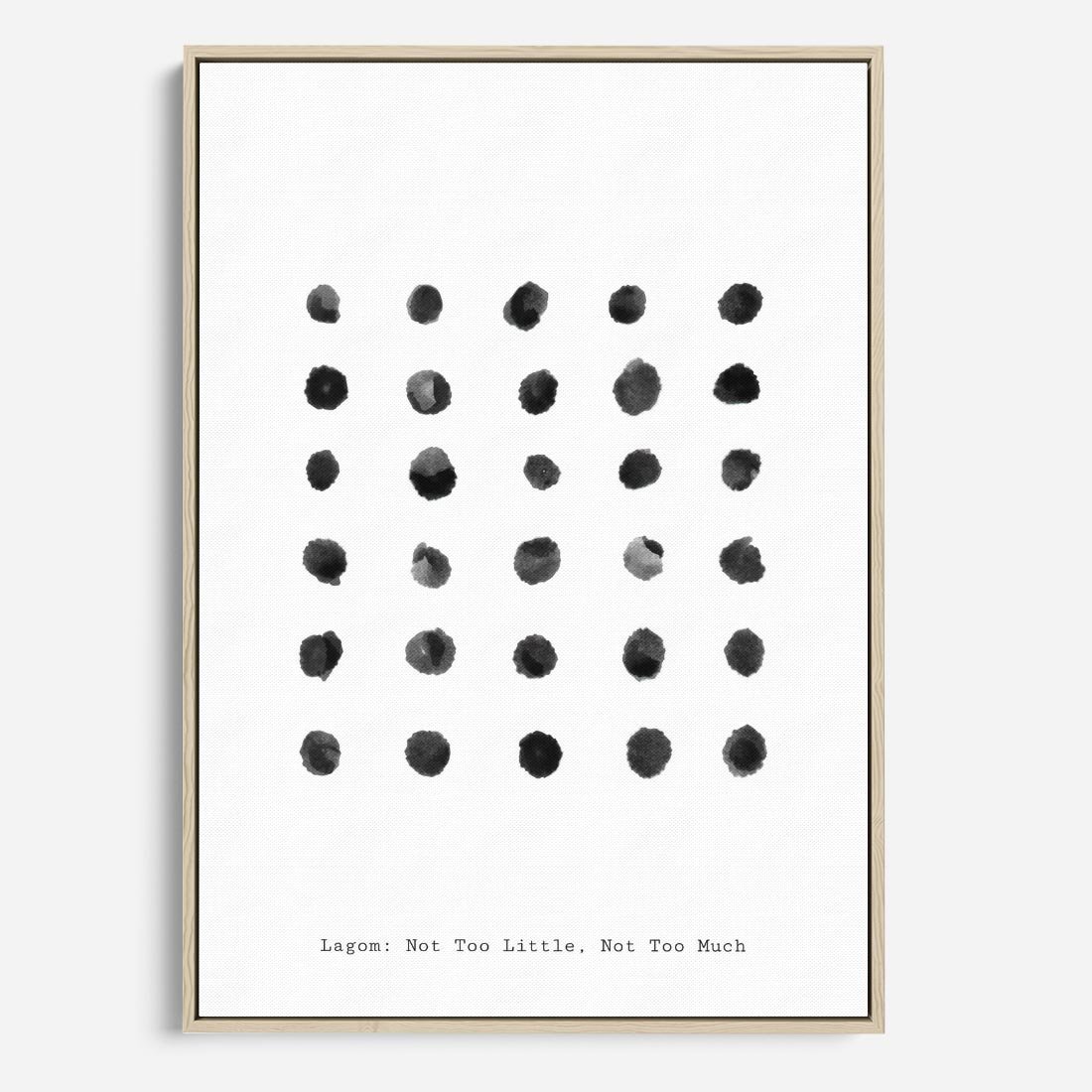 Ten minimalistyczny plakat skupia się na esencji prostoty poprzez czarne kropki na białym tle. Lagom typografia doskonale komponuje się z minimalistycznym wzornictwem, tworząc równowagę i spokój. To dzieło sztuki, które przypomina nam o mądrości w umiarze i pięknie w prostocie.