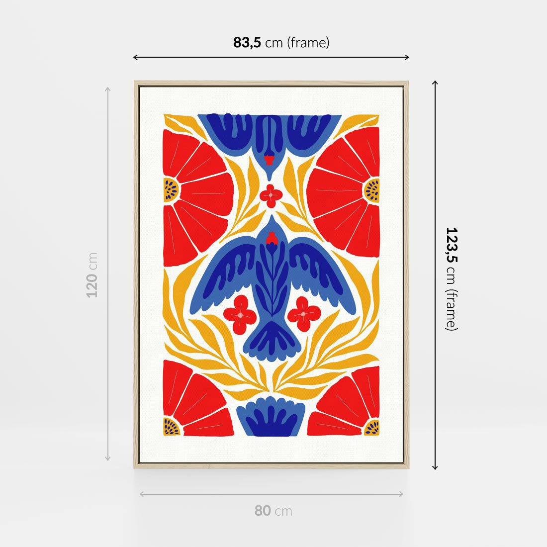 Wyrazista grafika ożywa mocnymi barwami czerwieni, niebieskiego i żółtego. Centralny ptak otoczony czerwonymi kwiatami tworzy dynamiczną kompozycję, która przyciąga wzrok i wzbudza emocje.