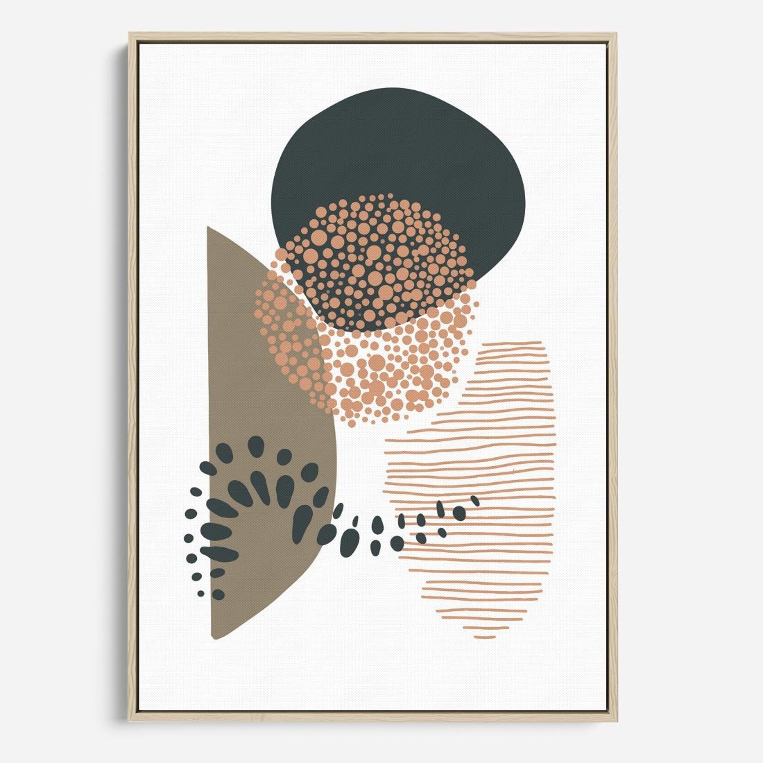 Ta abstrakcyjna kompozycja składa się z delikatnych kropek, kresek i kółek, w stonowanych odcieniach brązu i beżu. Przenosi spokój i harmonię, emanując minimalistycznym pięknem do każdego wnętrza.