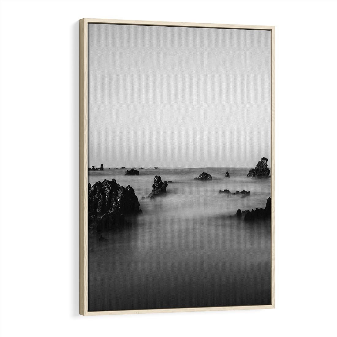 Obraz w ramie 80x120 - Harmonia świateł i cieni - zamglona dzika plaża, skały na plaży - rama drewno