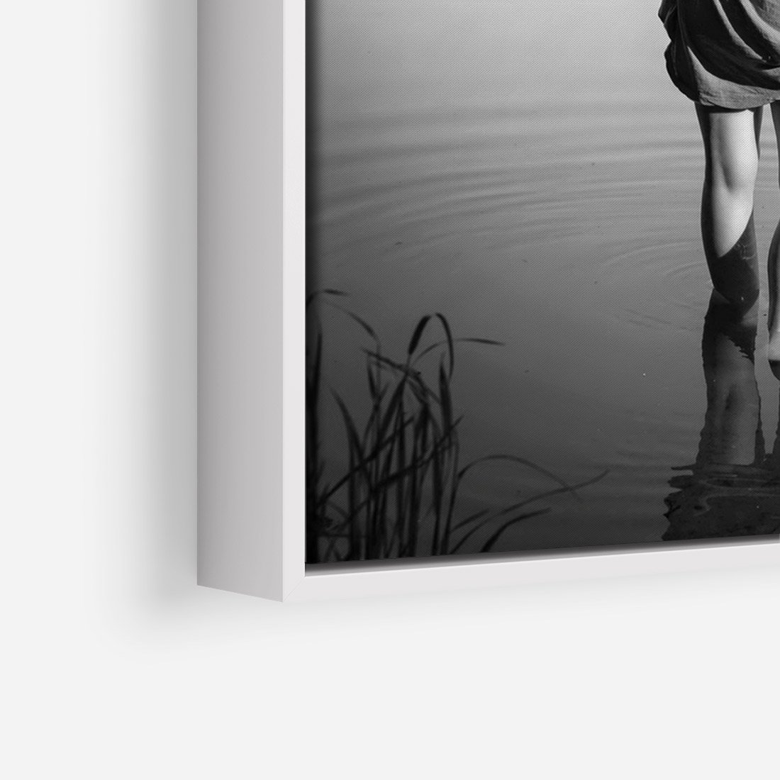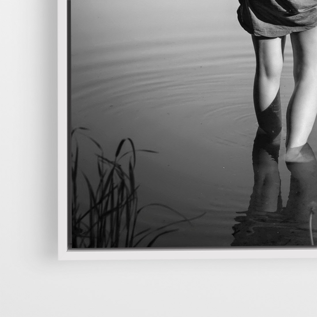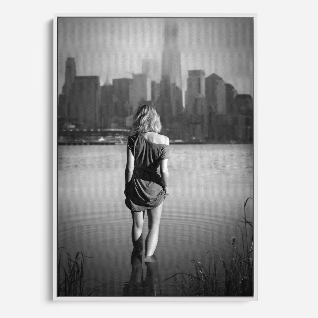 Obraz w ramie 80x120 - Kapiel w Mieście - czarno białe zdjęcie, kobieta wchodzi do wody - rama biała