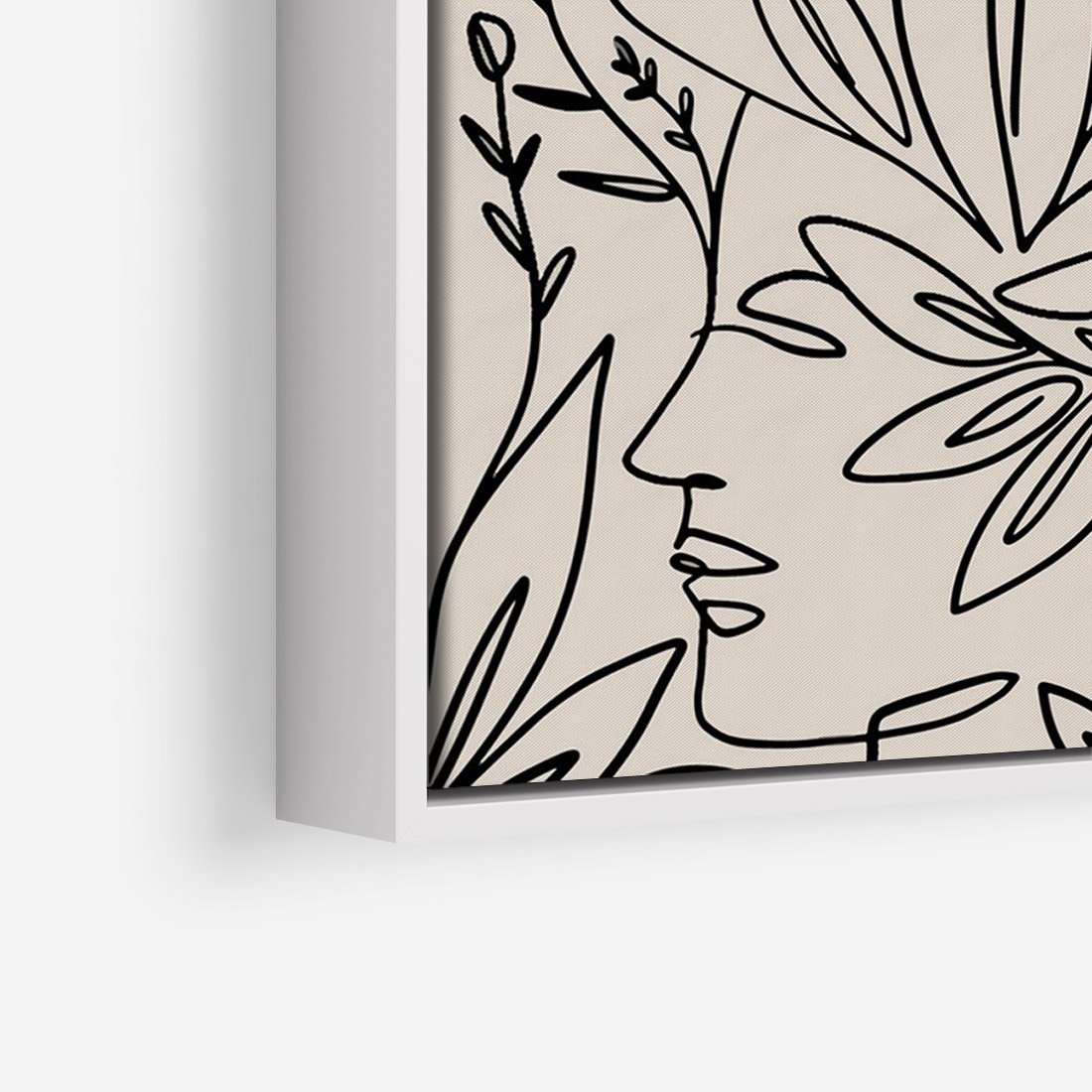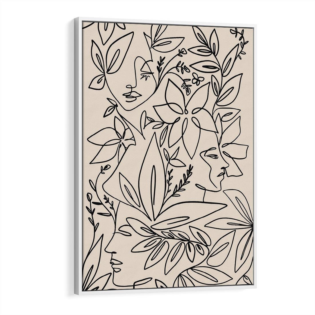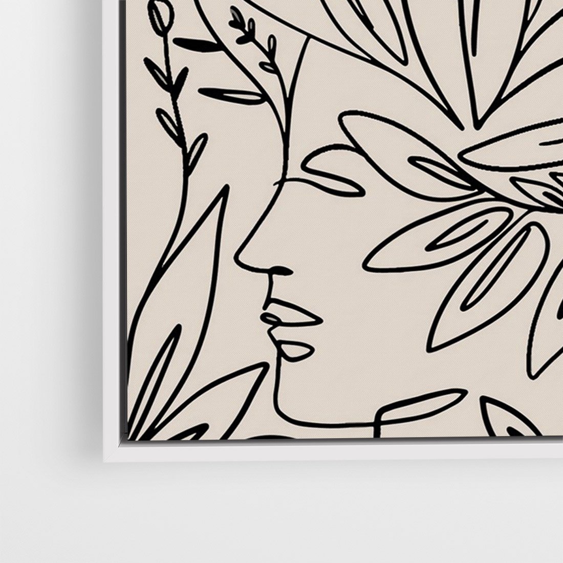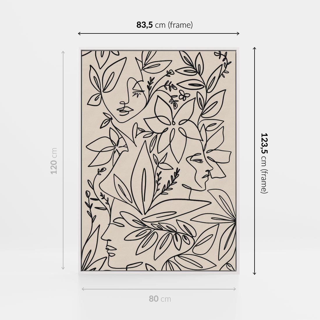 Obraz w ramie 80x120 - Kobiecy Portret Duszy - beżowe tło, czarny szkic nowoczesnych kwiatów - rama biała