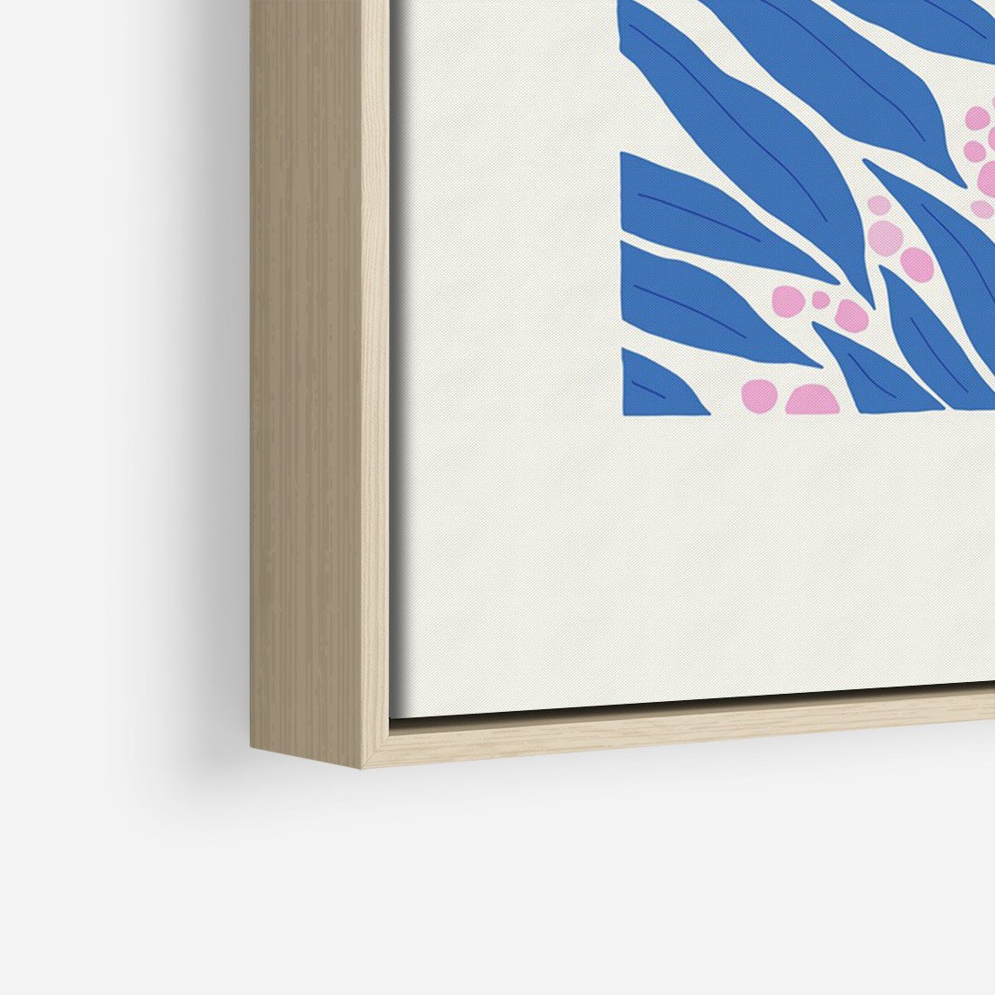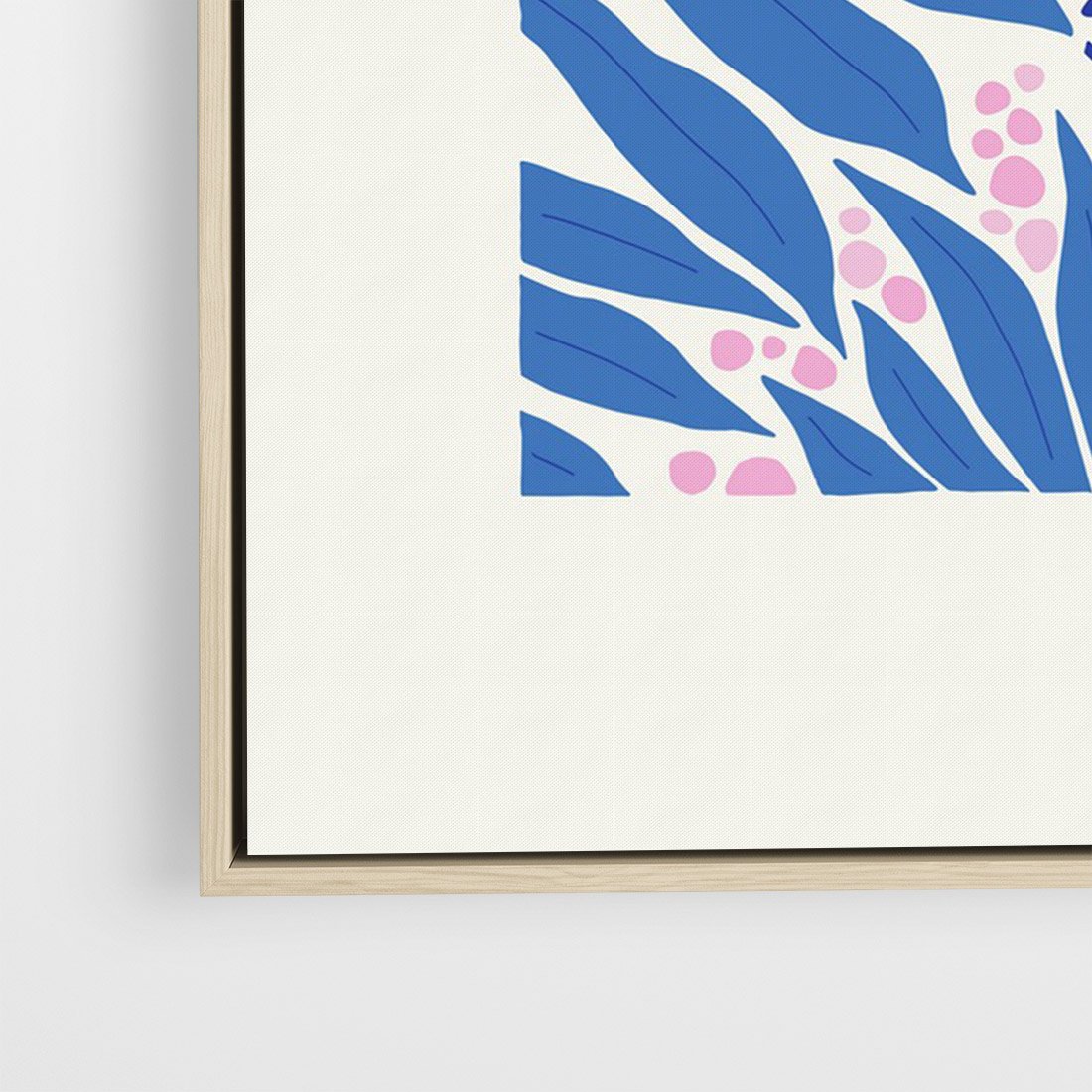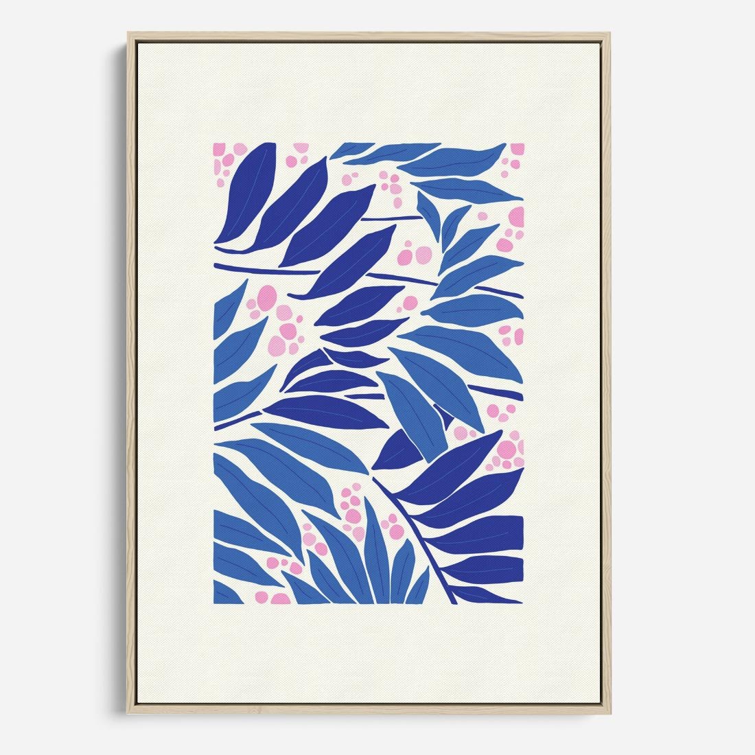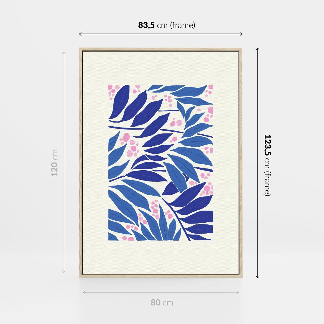 Ten nowoczesny plakat przedstawia abstrakcyjną liściastą kompozycję, w której dominują odcienie niebieskiego i błękitu. Sztuka ta tworzy spokojną i pełną harmonii atmosferę, zachęcając do kontemplacji natury i form w unikalny sposób.