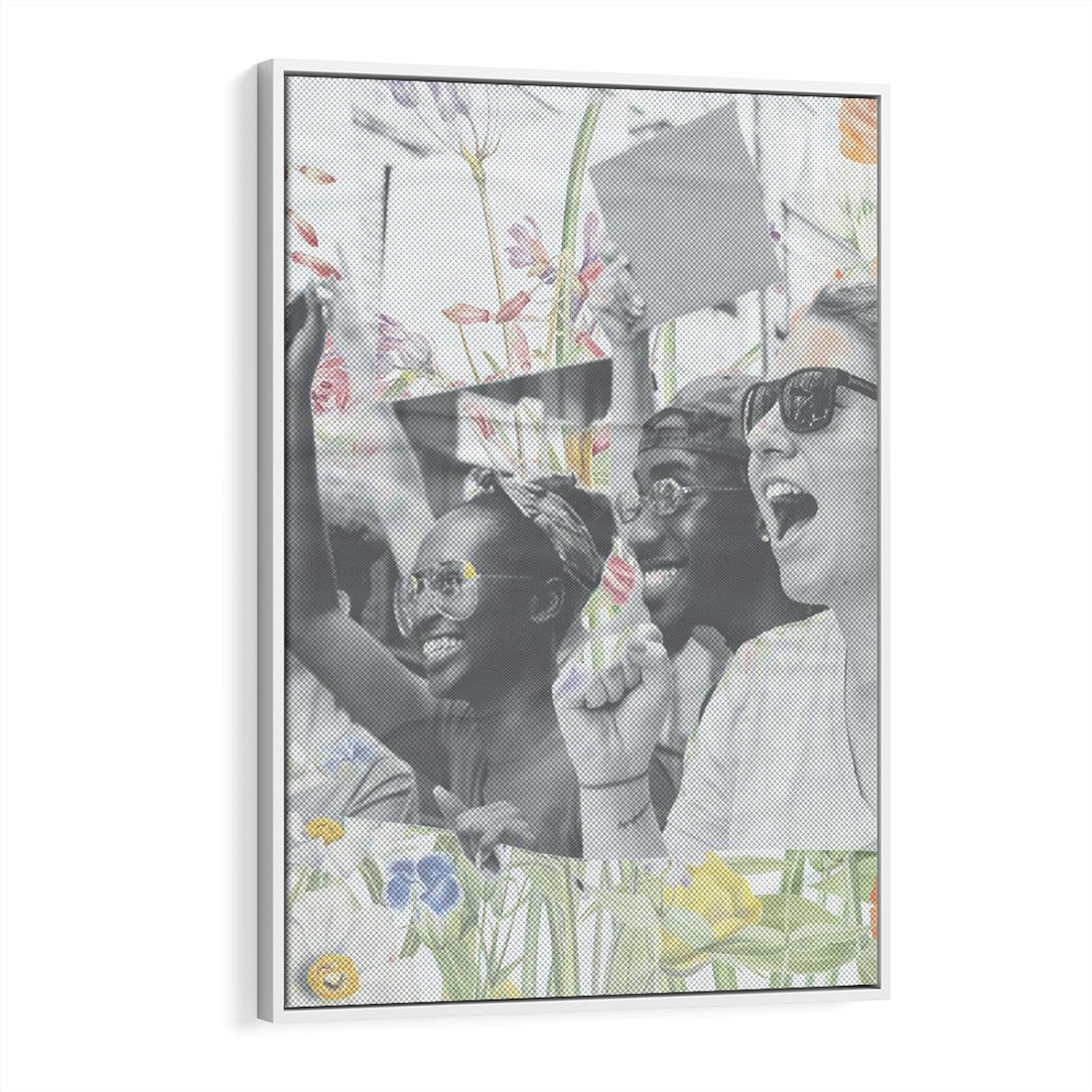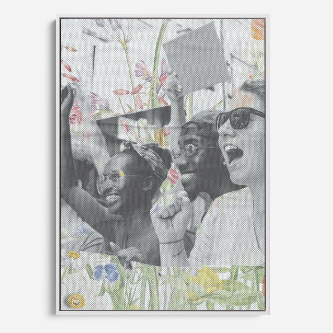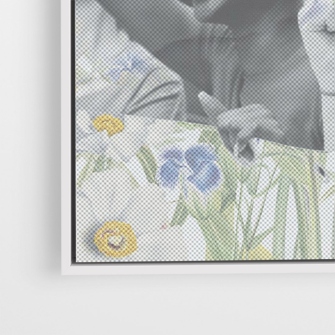 Zapraszamy do odkrycia tego wyjątkowego kolażu, który ukazuje czarno-białe zdjęcie wesołych młodych ludzi, otoczonych tłem z kwiatów retro. Doskonały akcent dla tych, którzy pragną wprowadzić do swoich wnętrz unikalny i radosny wyraz.