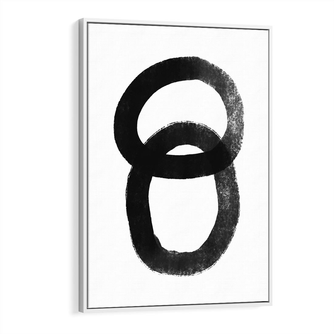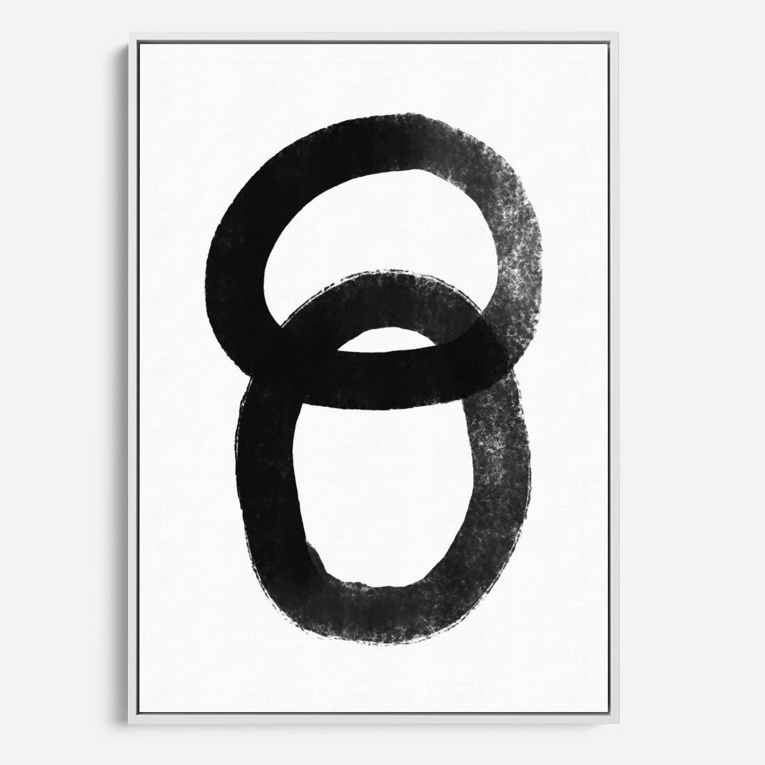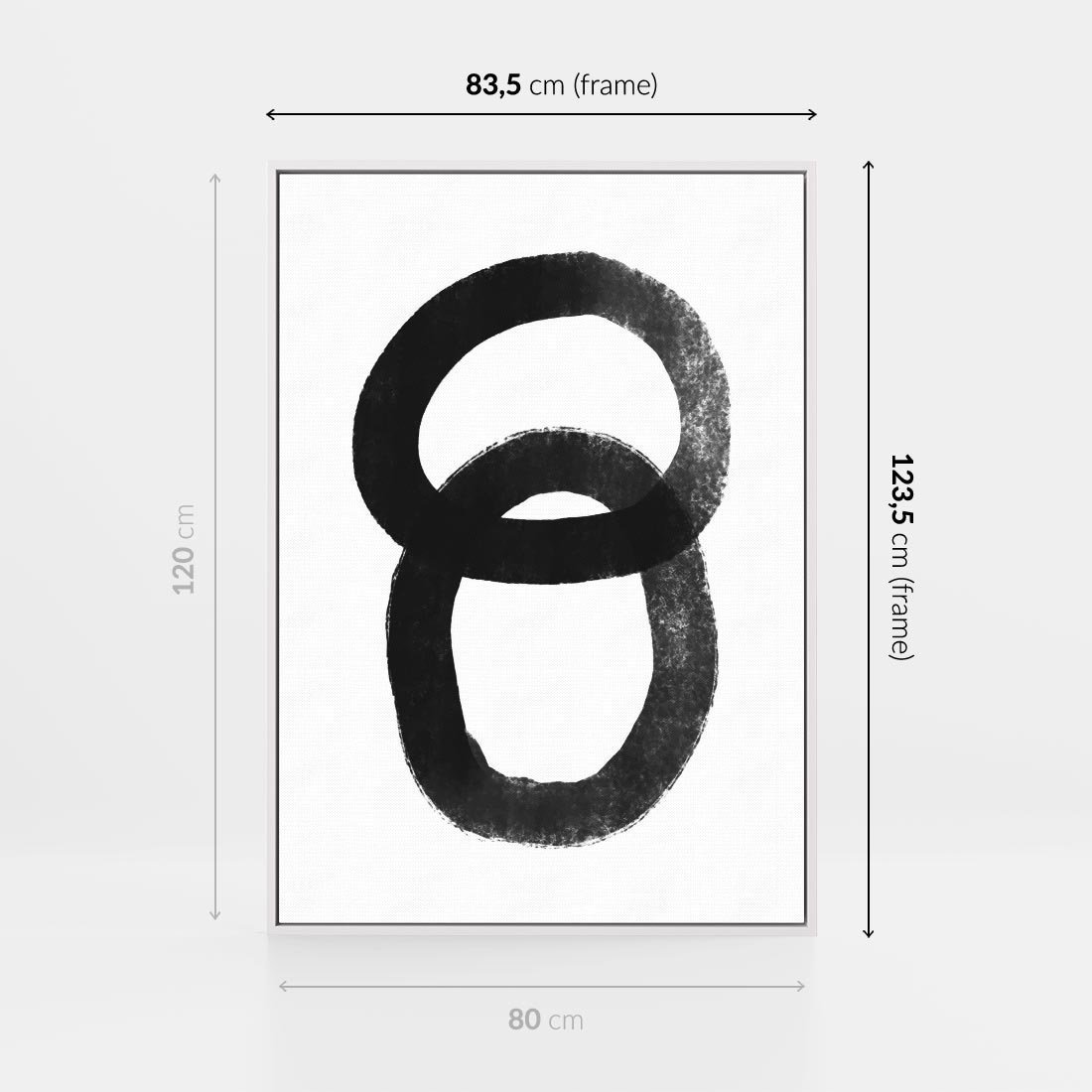 To abstrakcyjne dzieło sztuki w stylu minimalizmu i modern artu prezentuje czarne koła zaplecione w dynamiczną kompozycję. Jego proste, ale wyraziste formy oddają nowoczesny charakter, doskonale pasując do różnych przestrzeni i wzbogacając wnętrza o oryginalność.