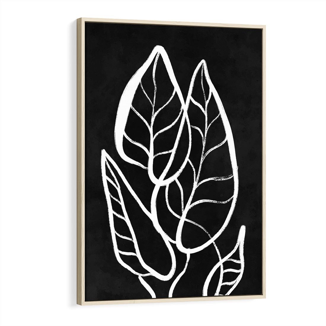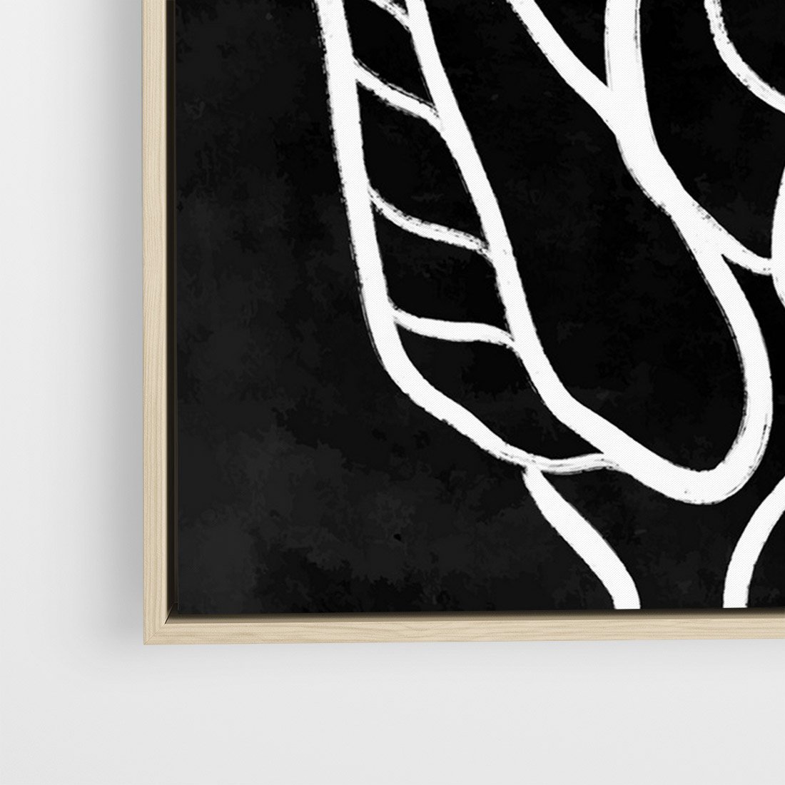 Biały szkic liści na głębokim czarnym tle tworzy mroczny minimalizm, który przyciąga uwagę i nadaje elegancji każdemu wnętrzu.