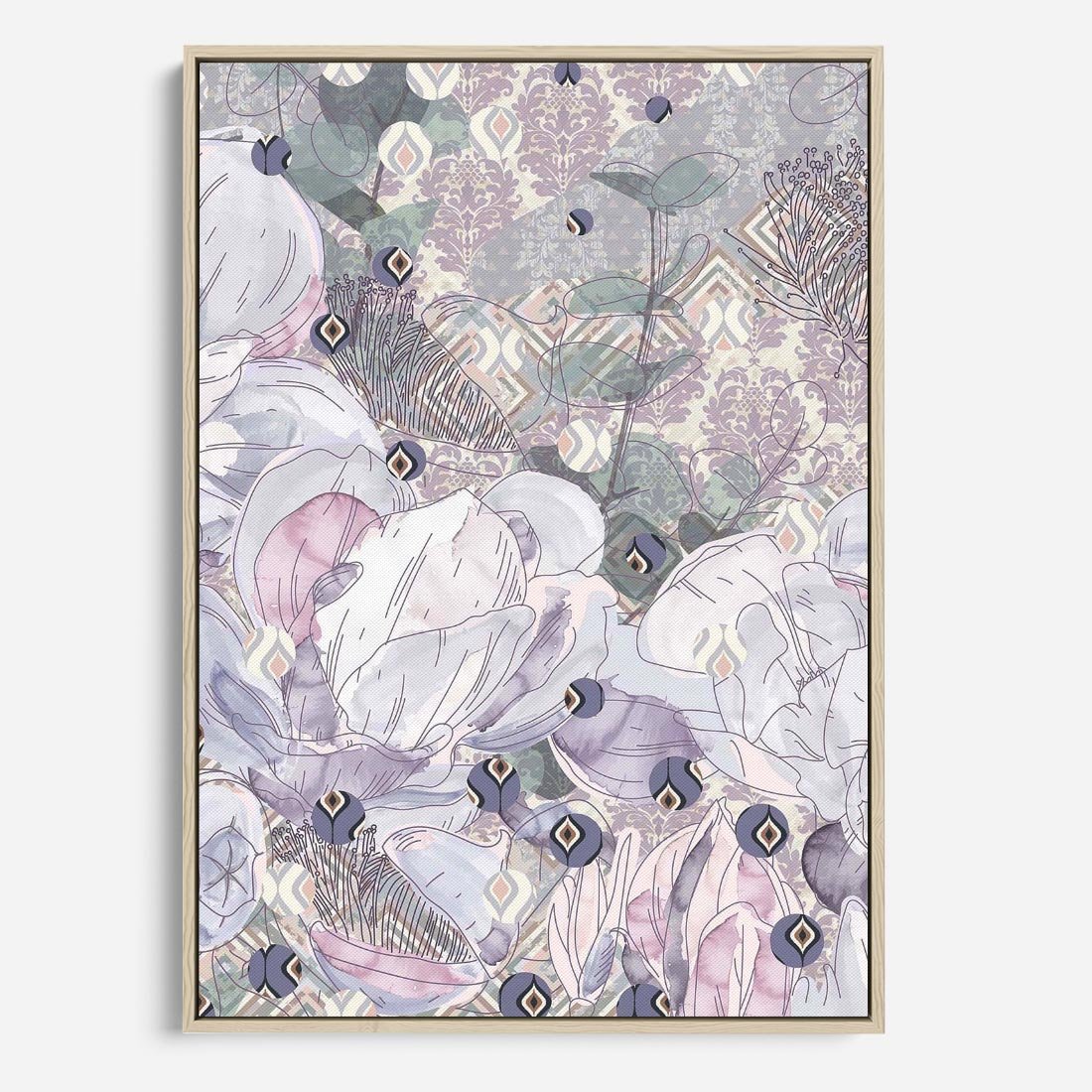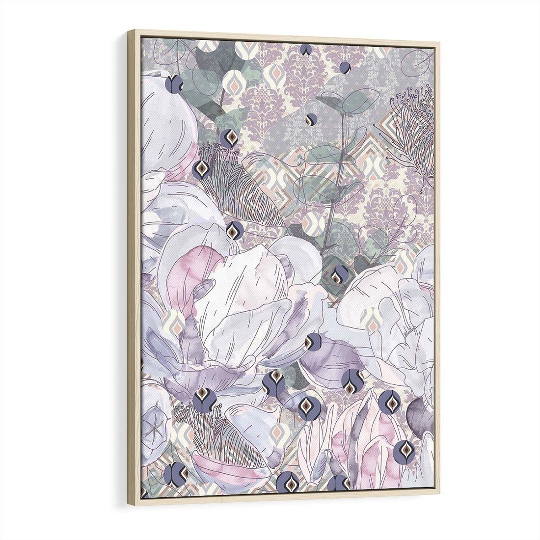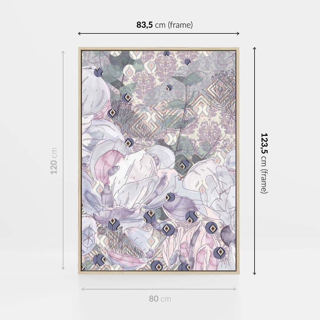 Obraz w ramie 80x120 - Malowane oddechy istnienia - pomieszane tekstury, kwiatowe elementy - rama drewno