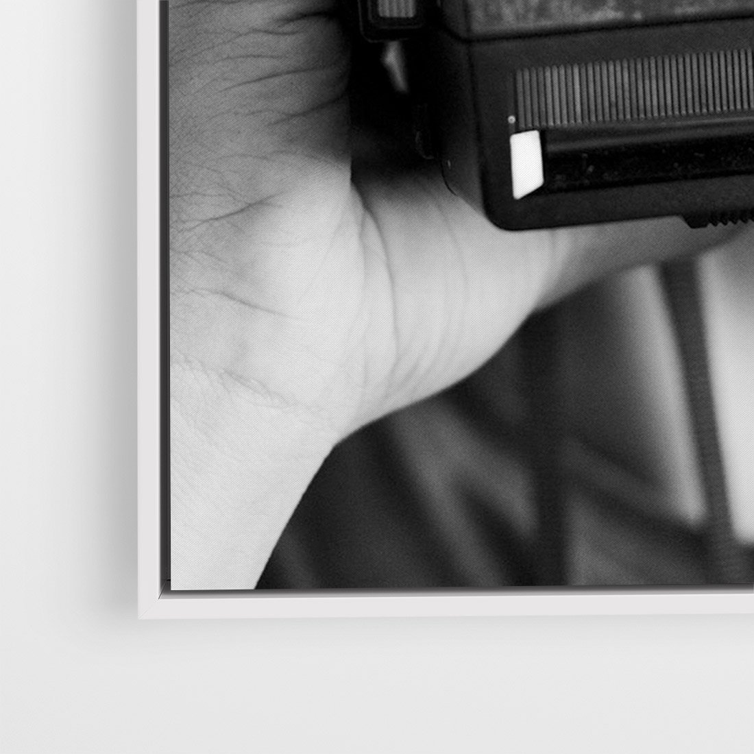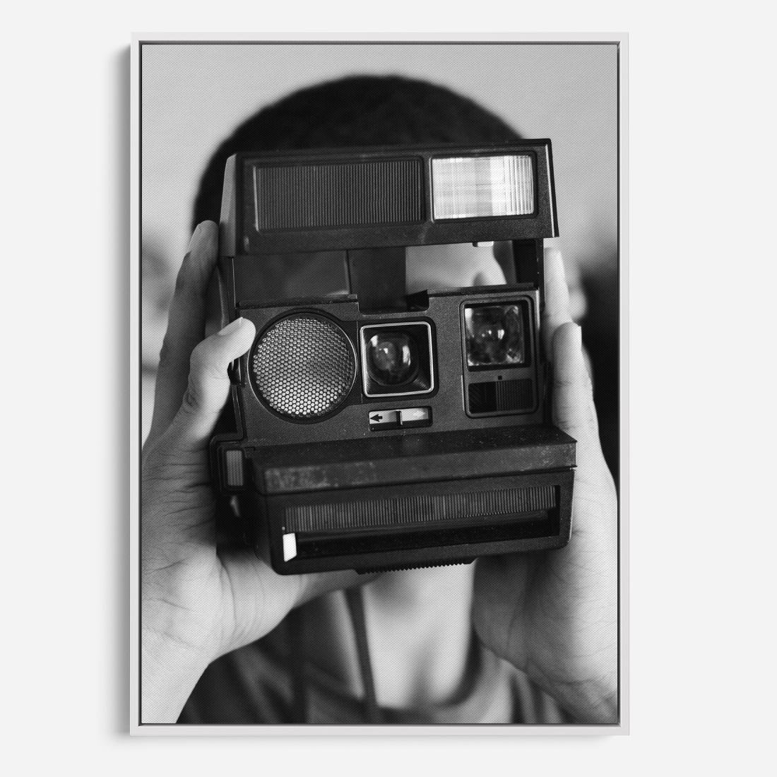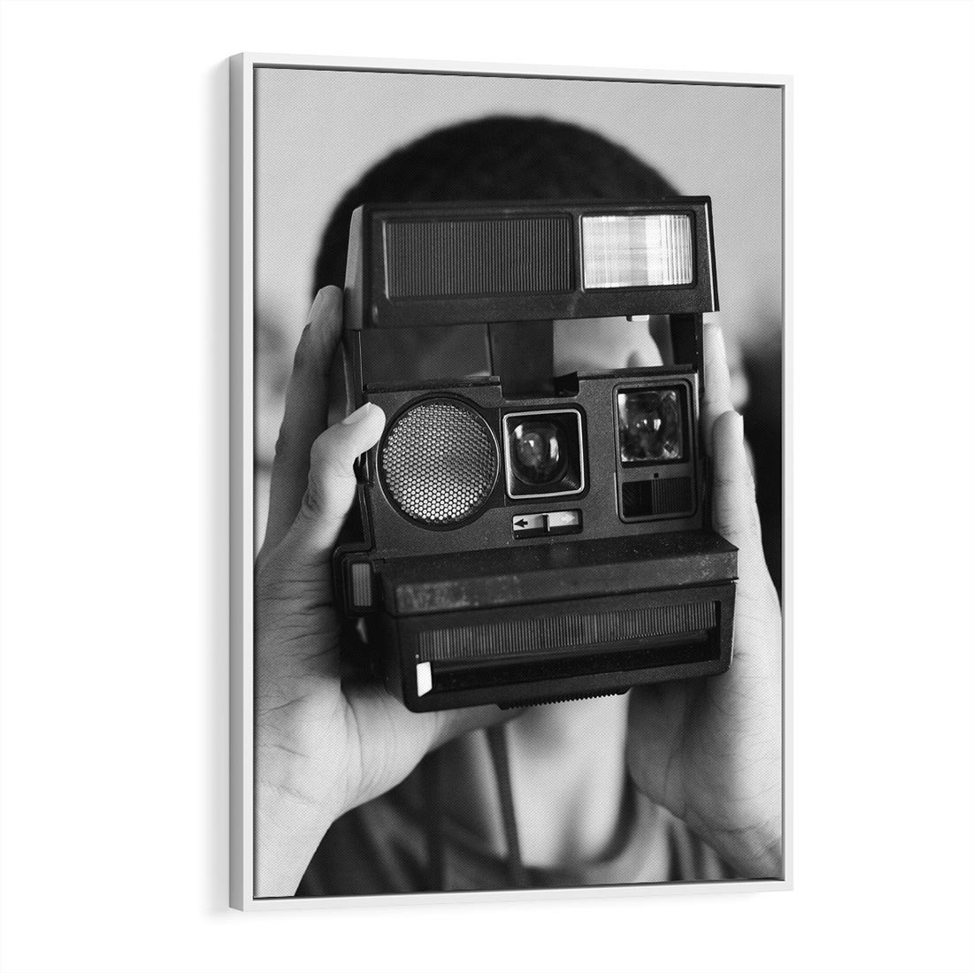 Czarno-biały portret przedstawia mężczyznę, który robi zdjęcie, używając polaroidu. Fotografia emanuje artystycznym wdziękiem, a klimat retro dodaje jej wyjątkowego charakteru. Ten obraz przenosi nas w świat sztuki i fotografii, wzbudzając zainteresowanie i ciekawość. Idealny dodatek do wnętrz, które pragną zachować artystyczną duszę.
