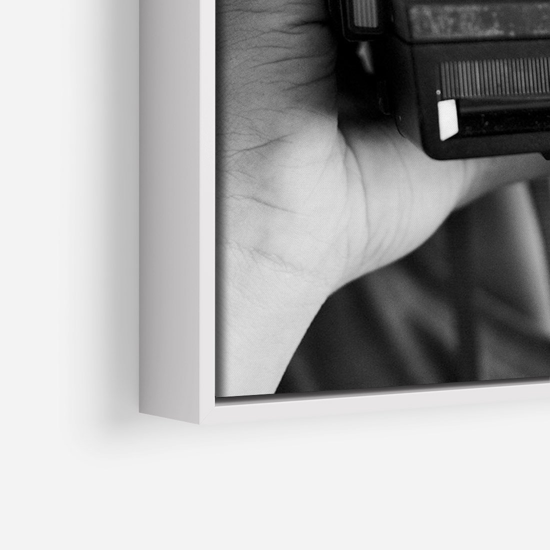 Obraz w ramie 80x120 - Mężczyzna za Aparatem - czarno białe zdjęcie, portret - rama biała