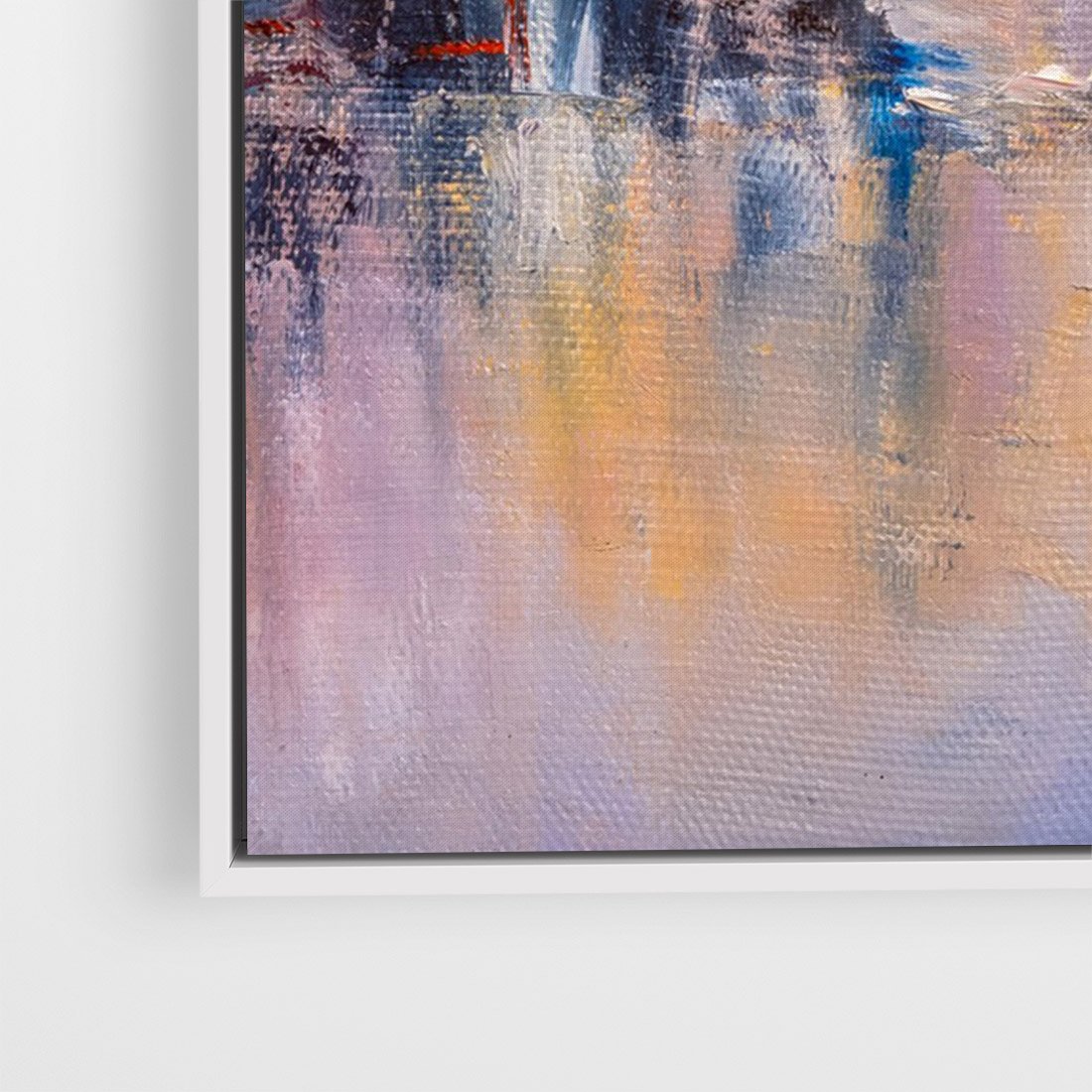 Obraz w ramie 80x120 - Miasto Refleksji - olejna panorama miasta w oddali, wiezowce odbijają się w rzece - rama biała