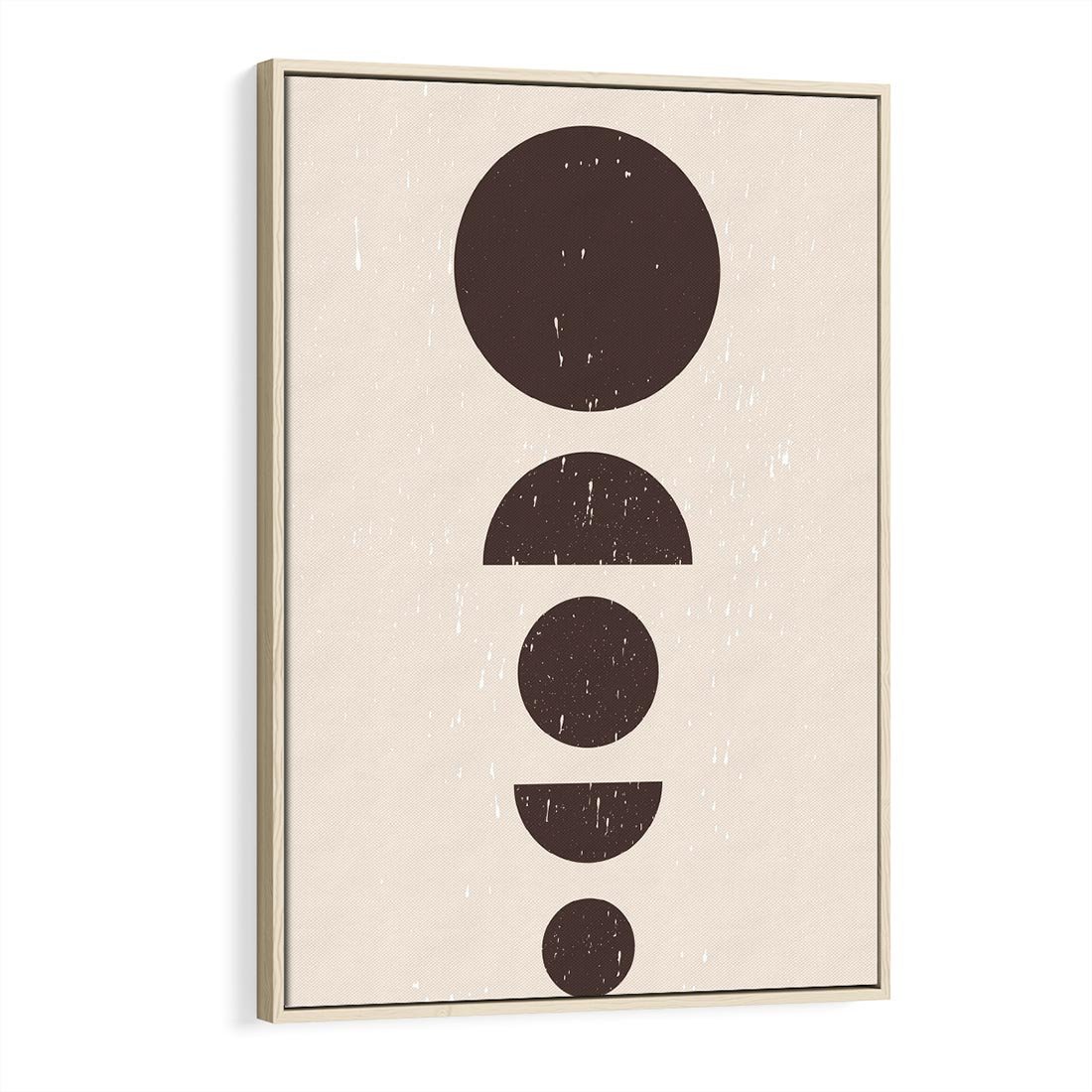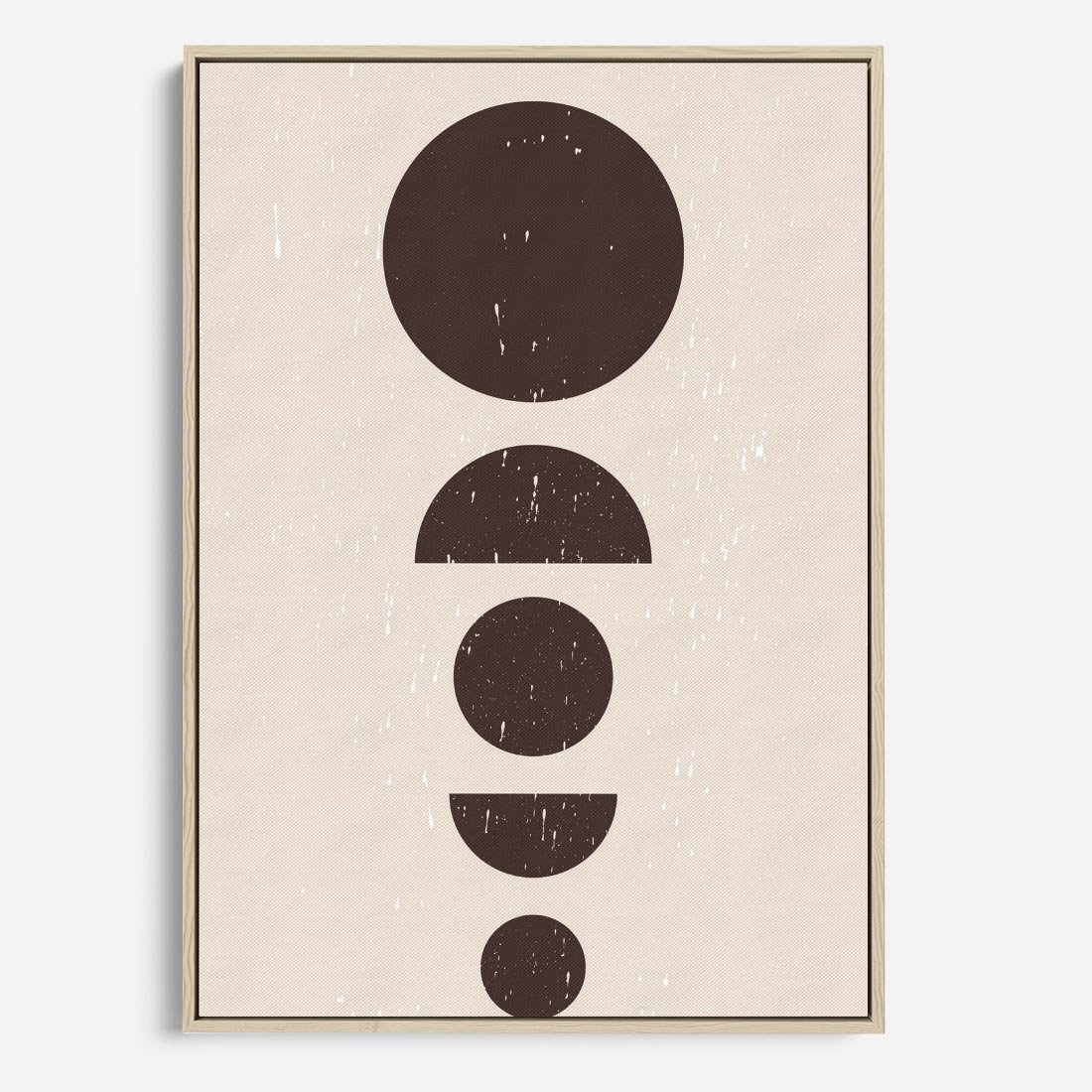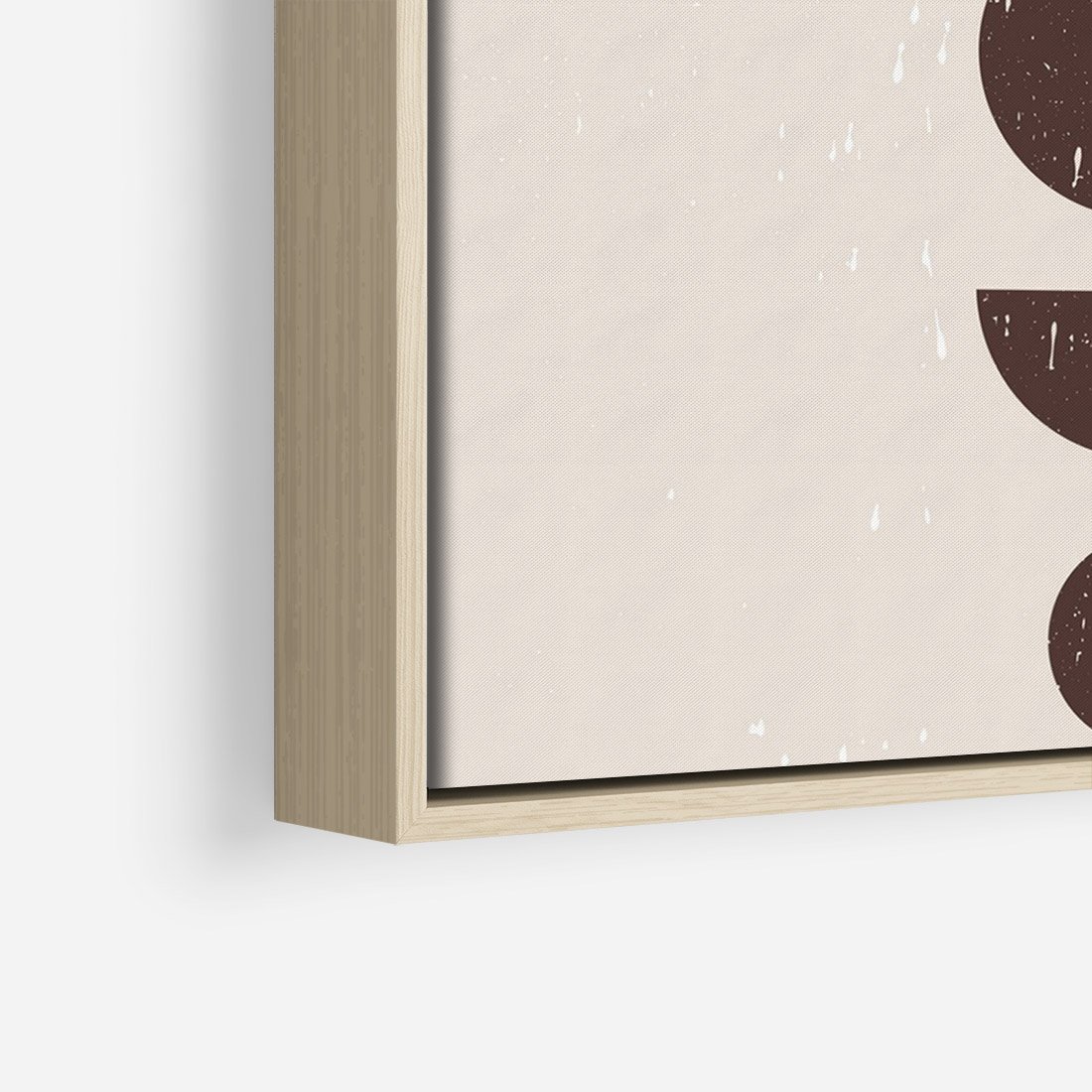 Ta nowoczesna grafika w stylu mid century prezentuje brązowe koła i półkola w minimalistycznym ujęciu, tworząc unikalny design o subtelnym wyrazie.