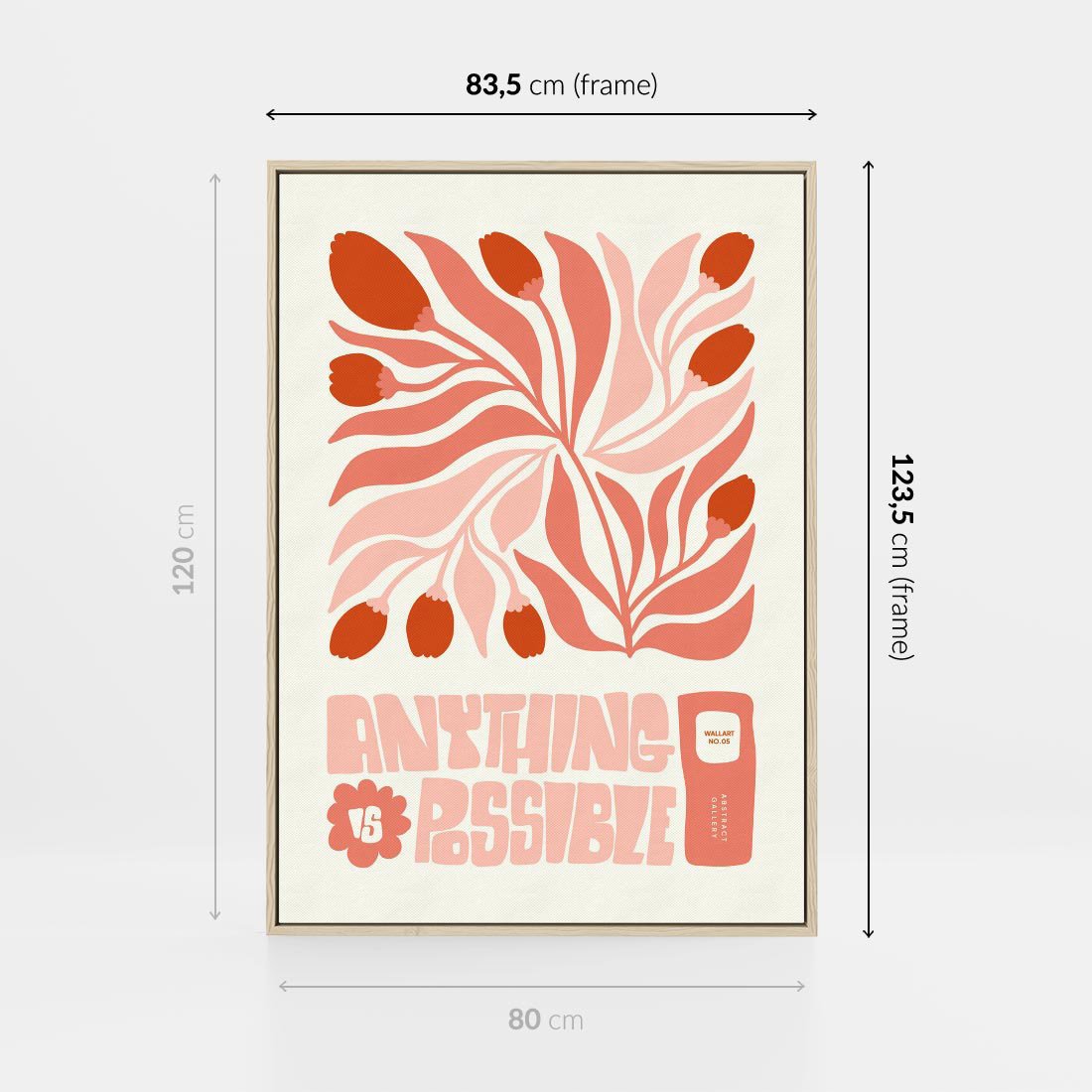 Ta nowoczesna sztuka przedstawia kompozycję w ciepłym łososiowym kolorze, z abstrakcyjnymi kwiatami i wyrazistą typografią. Tworzy ona piękną równowagę między naturą a sztuką, emanując spokojem i elegancją.