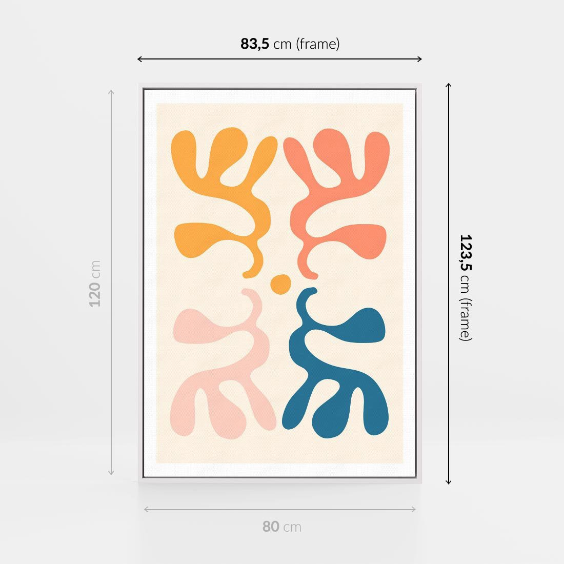 Ten nowoczesny plakat przedstawia abstrakcyjne, dziwne formy w delikatnych pastelowych kolorach. Kompozycja tworzy interesujący kontrast między nowoczesnym stylem a subtelnością kolorów, dodając unikalnego charakteru do przestrzeni.