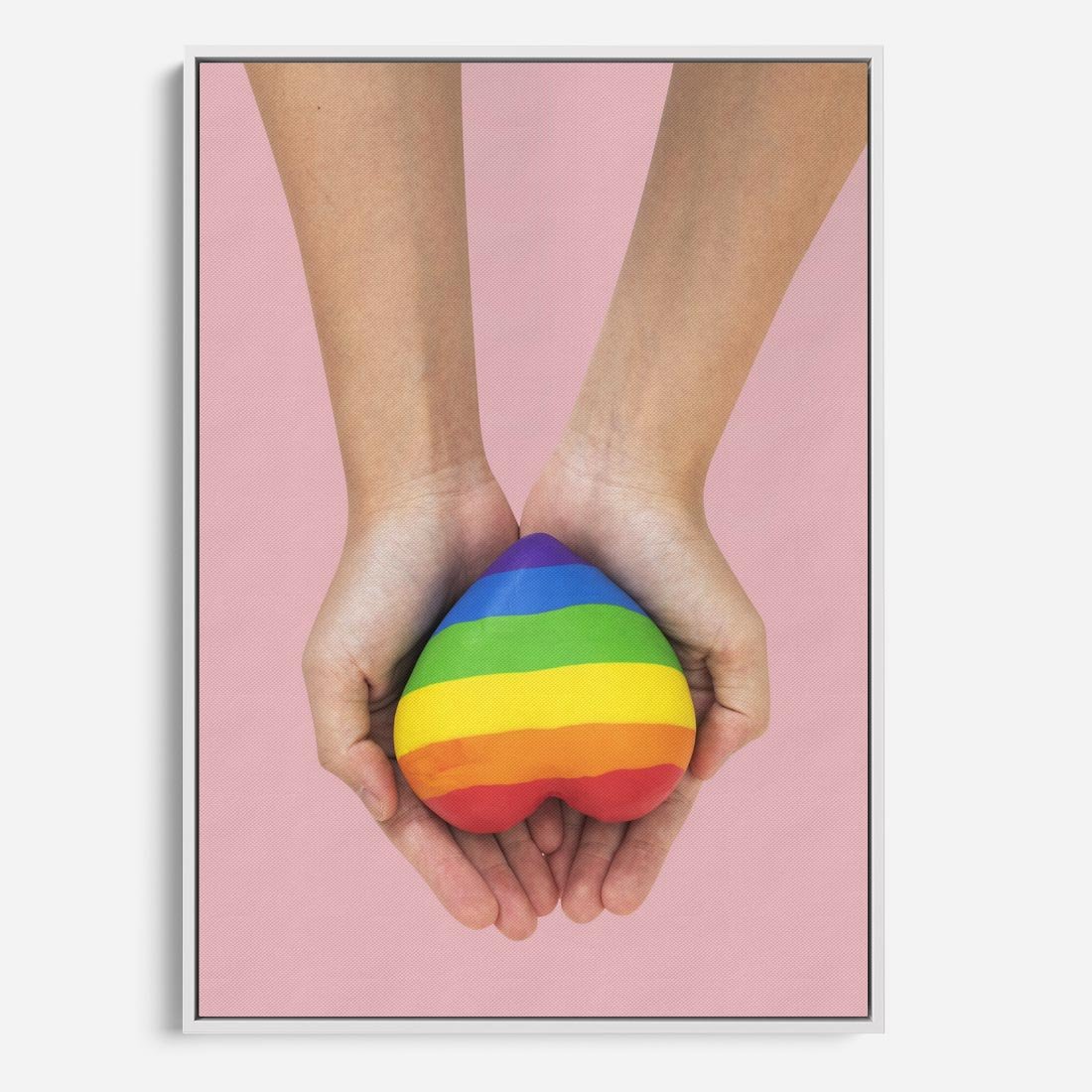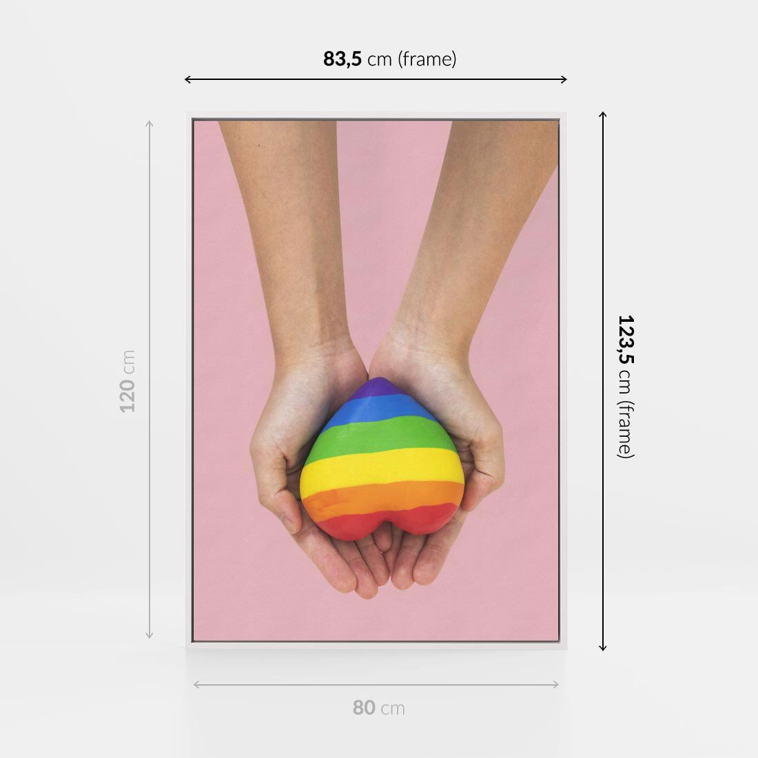 Obraz w ramie 80x120 - Miłość na Dłoniach - zdjęcie, dłonie trzymają ulepione tęczowe serce - rama biała