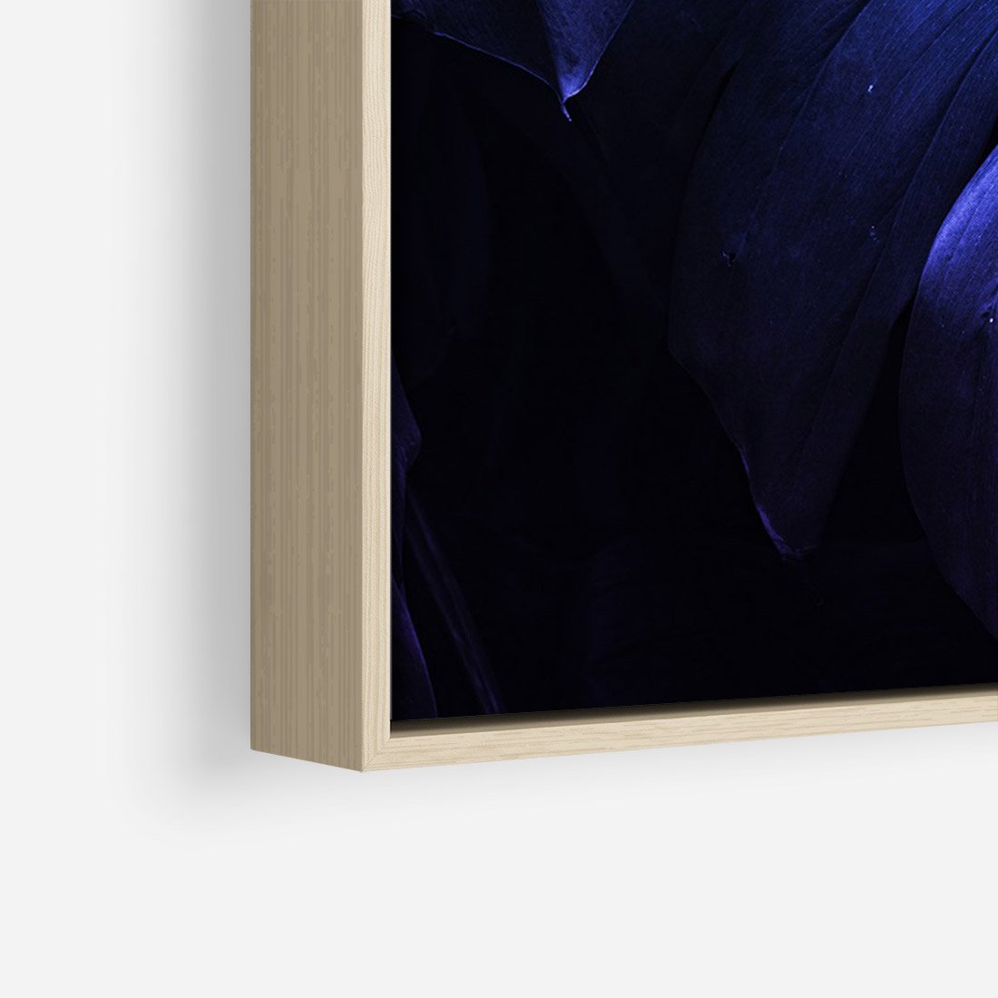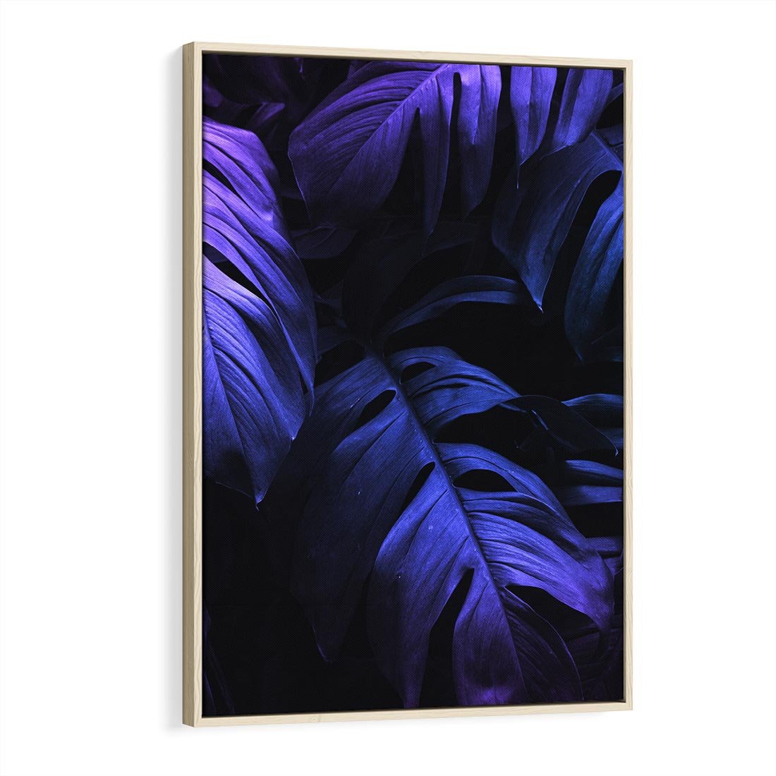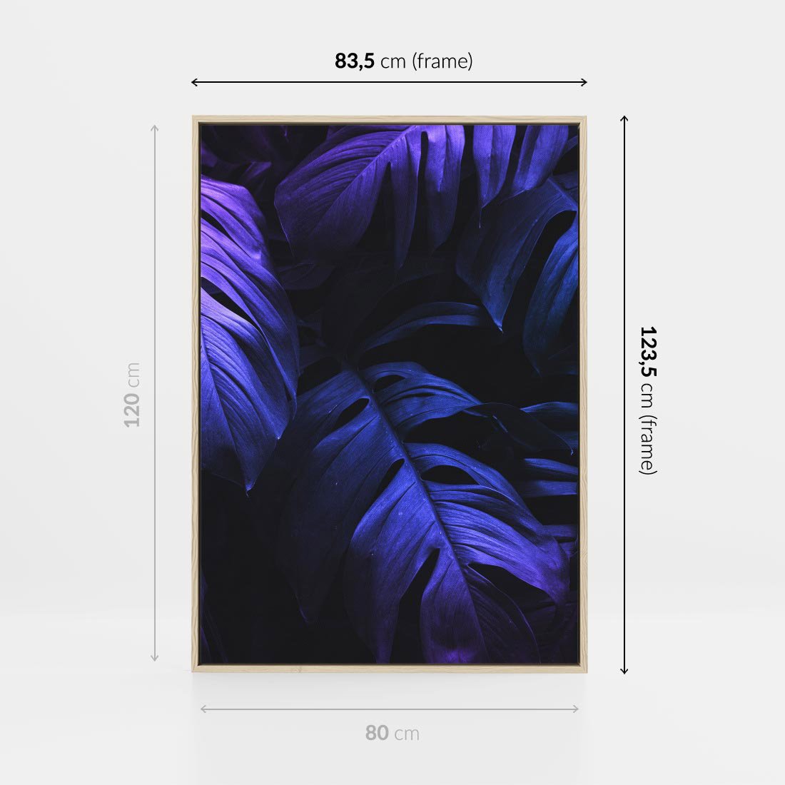 Obraz w ramie 80x120 - Mroczna Magia Dżungli - mroczna grafika, fioletowe liście monstery na czarnym tle - rama drewno