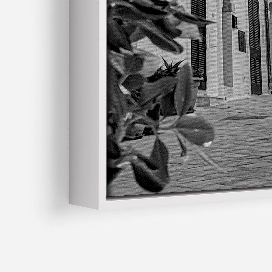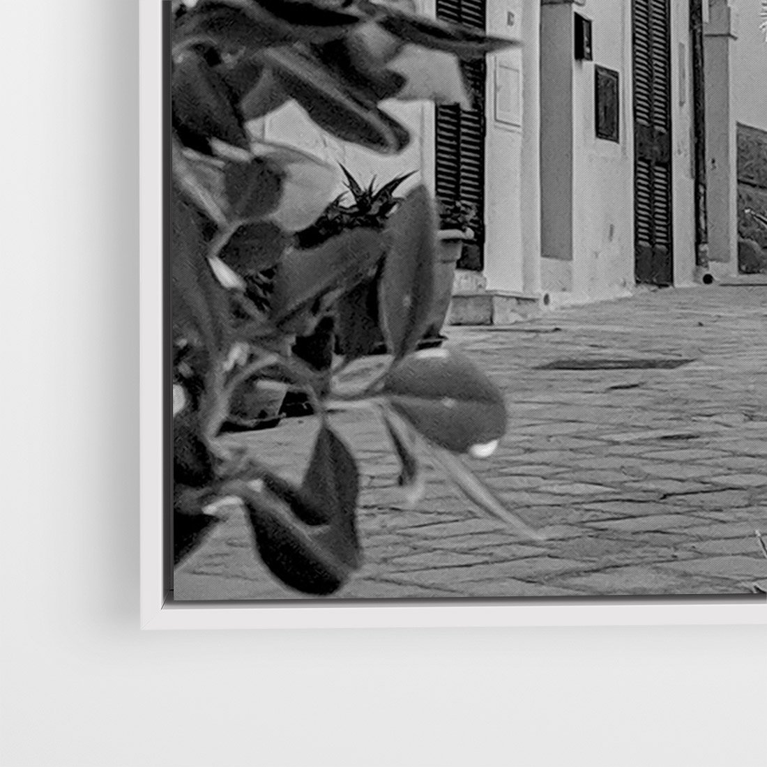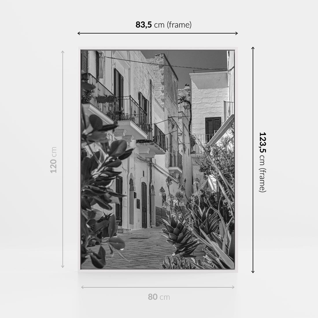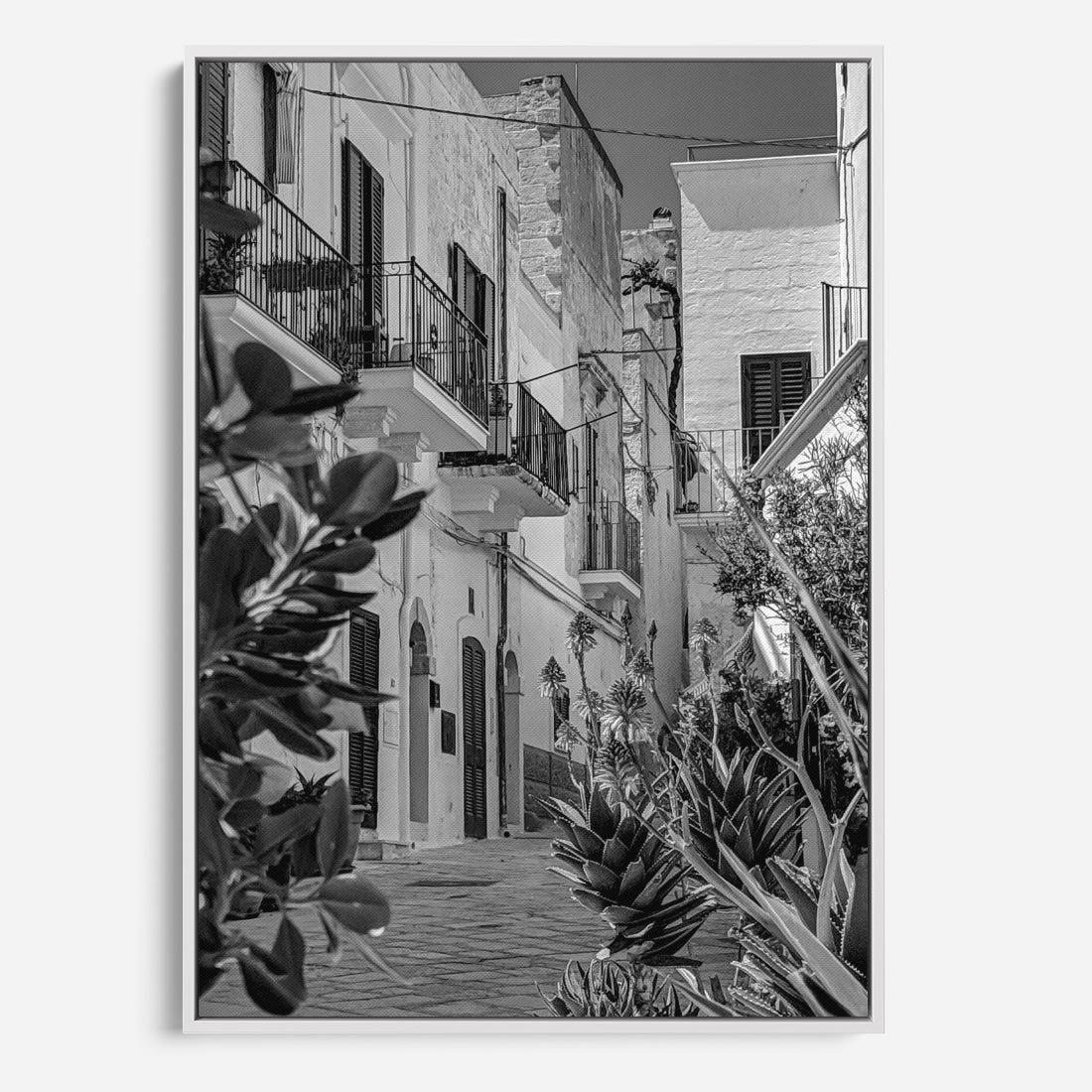 Obraz w ramie 80x120 - Nadmorska Uliczka - czarno białe zdjecie, uliczka w nadmorskim mieście - rama biała