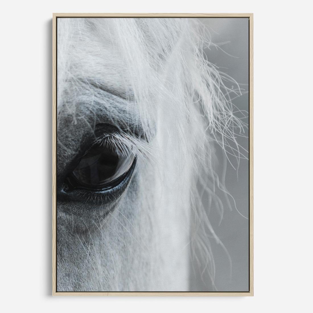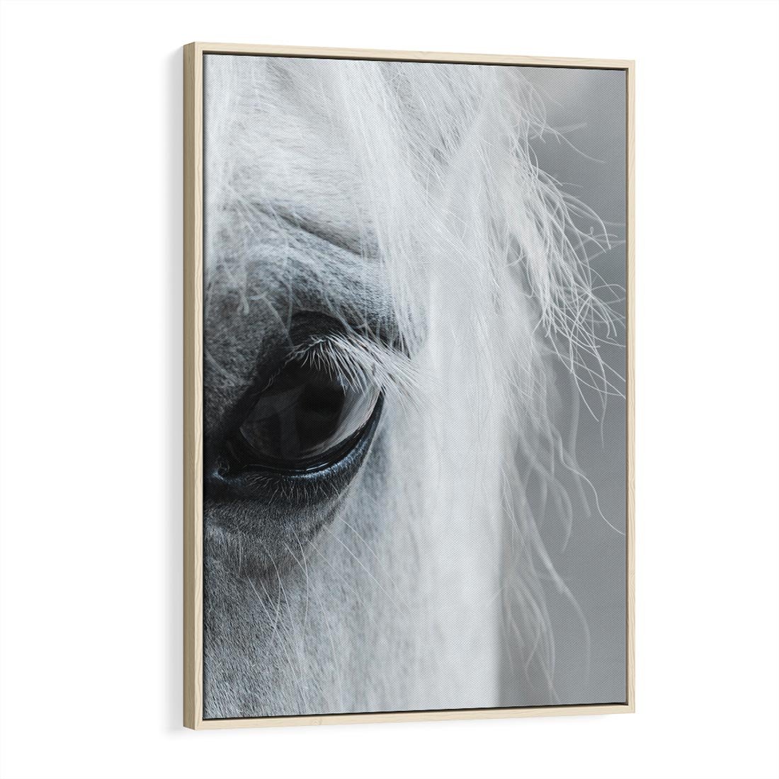 Obraz w ramie 80x120 - Oko Mocy - czarno białe zdjęcie, zbliżenie makro na oko konia - rama drewno