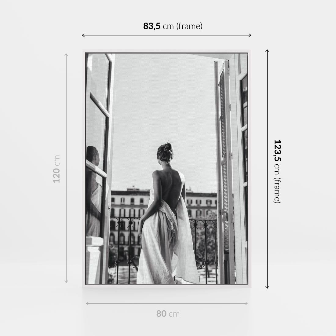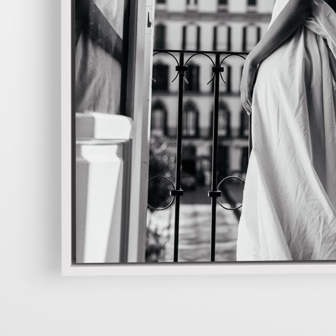 Obraz w ramie 80x120 - Poranki w Paryżu - czarno białe zdjęcie, kobieta w prześcieradle na balkonie - rama biała
