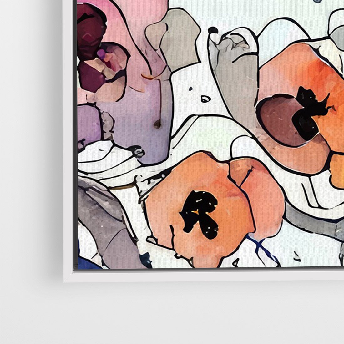 Ten obraz przypomina witrażowe kompozycje, gdzie akwarelowe kwiaty ożywają w intensywnych kolorach. Czarne kontury wydobywają ich piękno i nadają im wyrazistość. To połączenie kunsztu witrażowego z subtelnością kwiatowych motywów tworzy niepowtarzalną wizję natury.