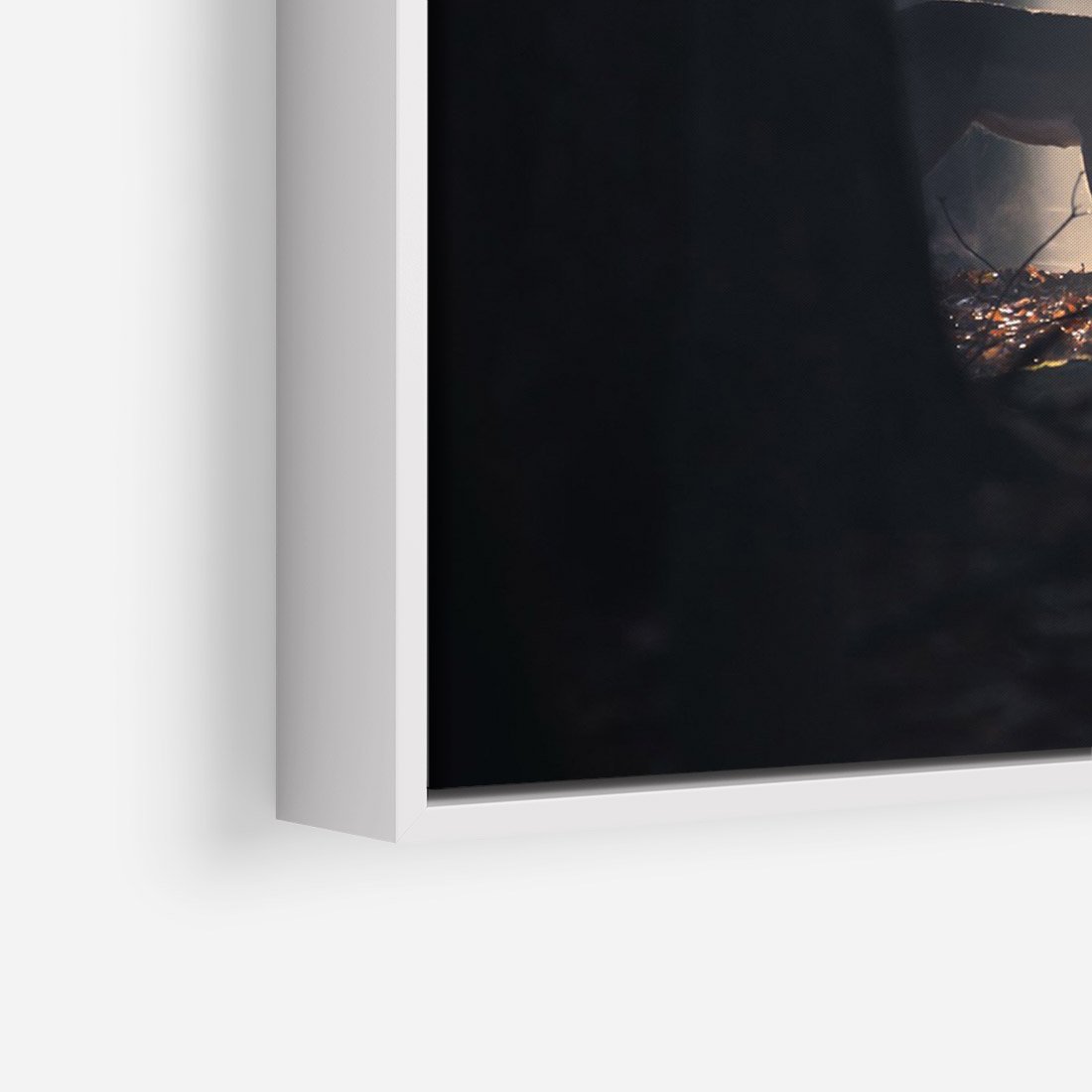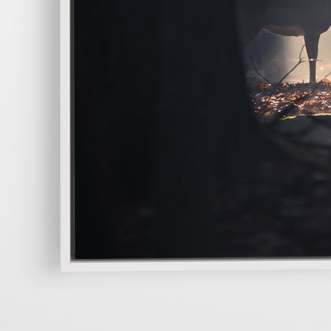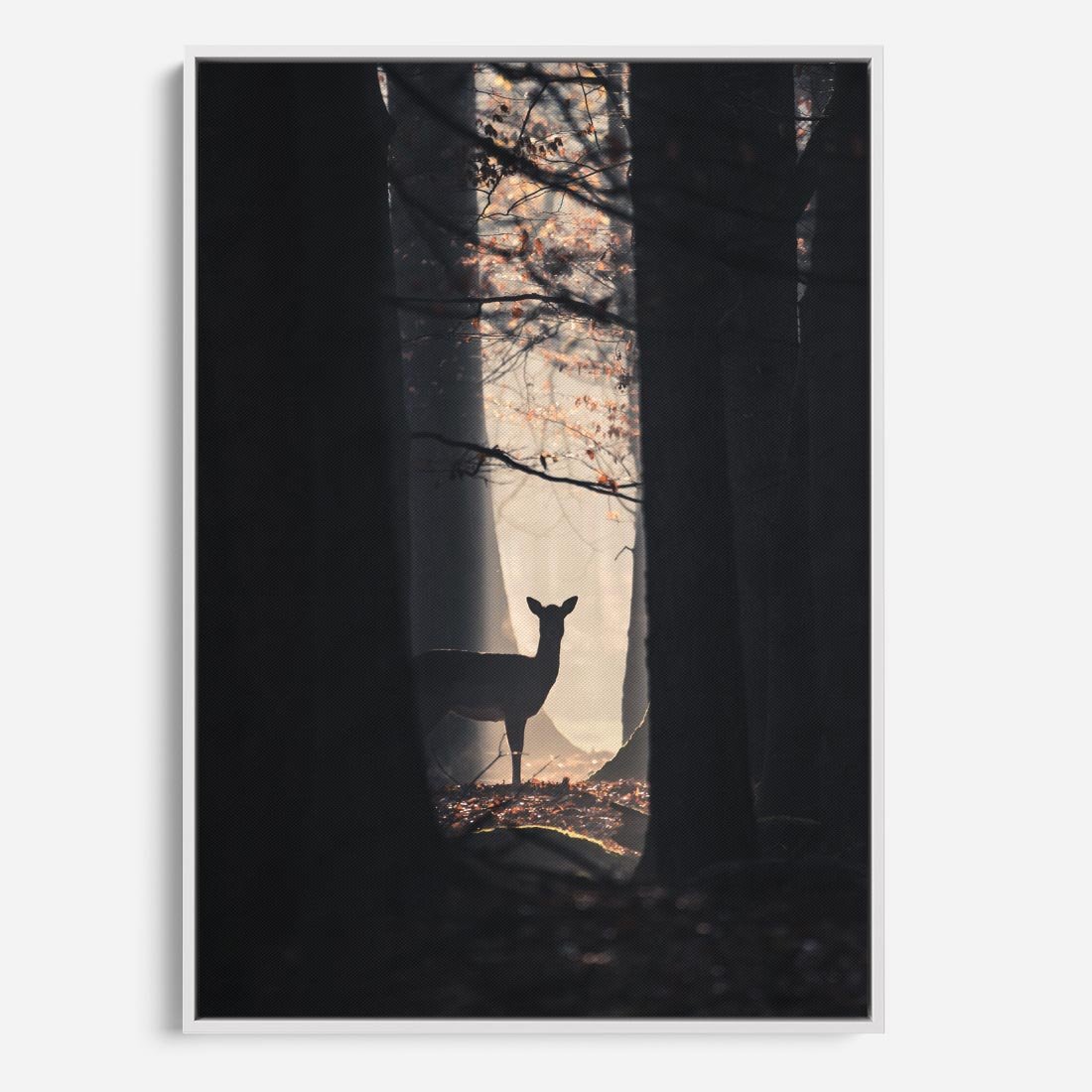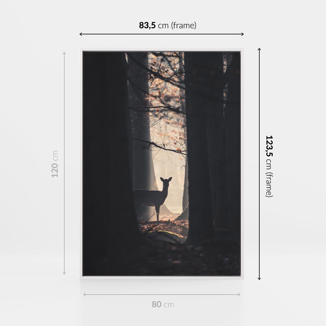 Obraz w ramie 80x120 - Sarnie Skoki - zdjęcie, klimatyczny las - rama biała