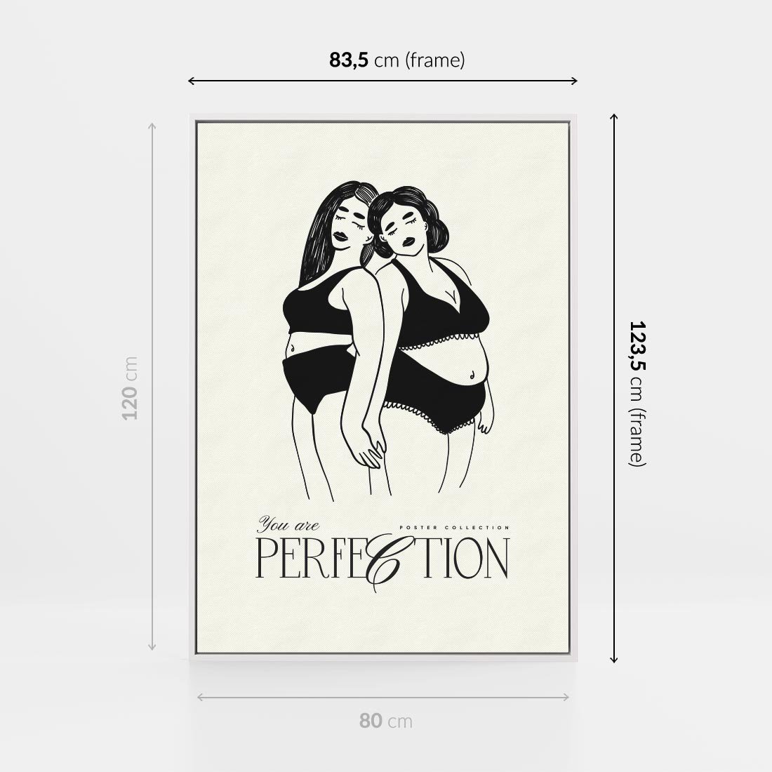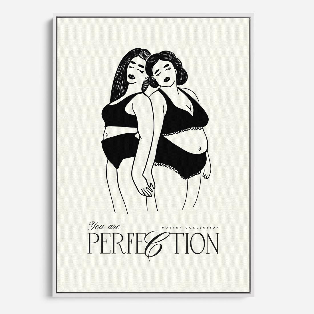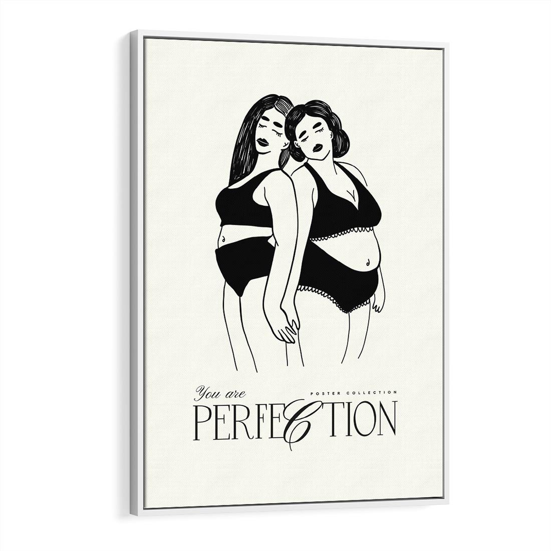 Ten nowoczesny plakat przedstawia dwie kobiety w bieliźnie, promując wartość samoakceptacji. Ich połączenie symbolizuje wspólnotę i siłę kobiecej natury, podkreślanej inspirującą typografią.