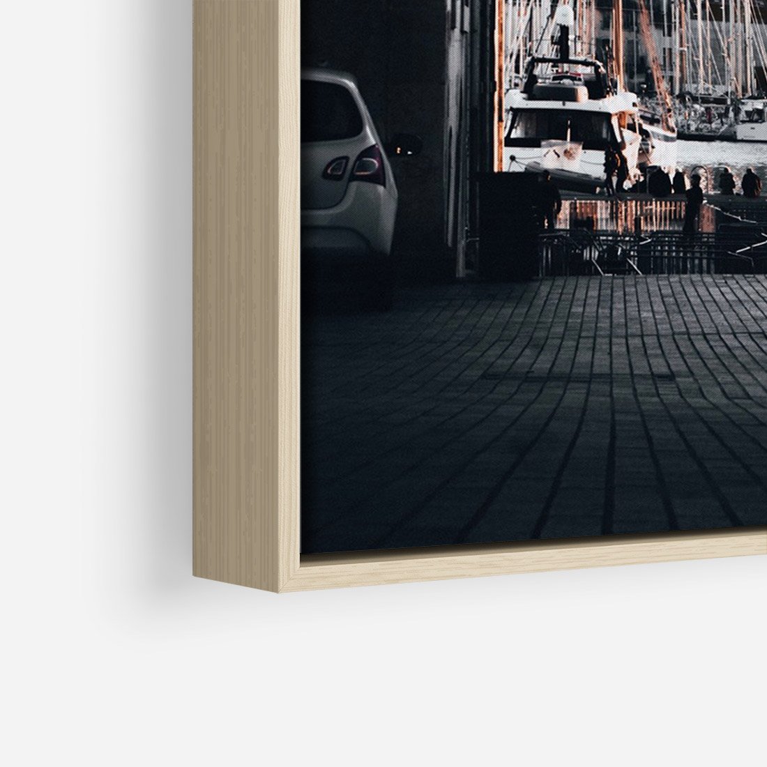 Obraz w ramie 80x120 - Światło Portowe - czarno białe zdjecie, uliczka w nadmorskim mieście - rama drewno