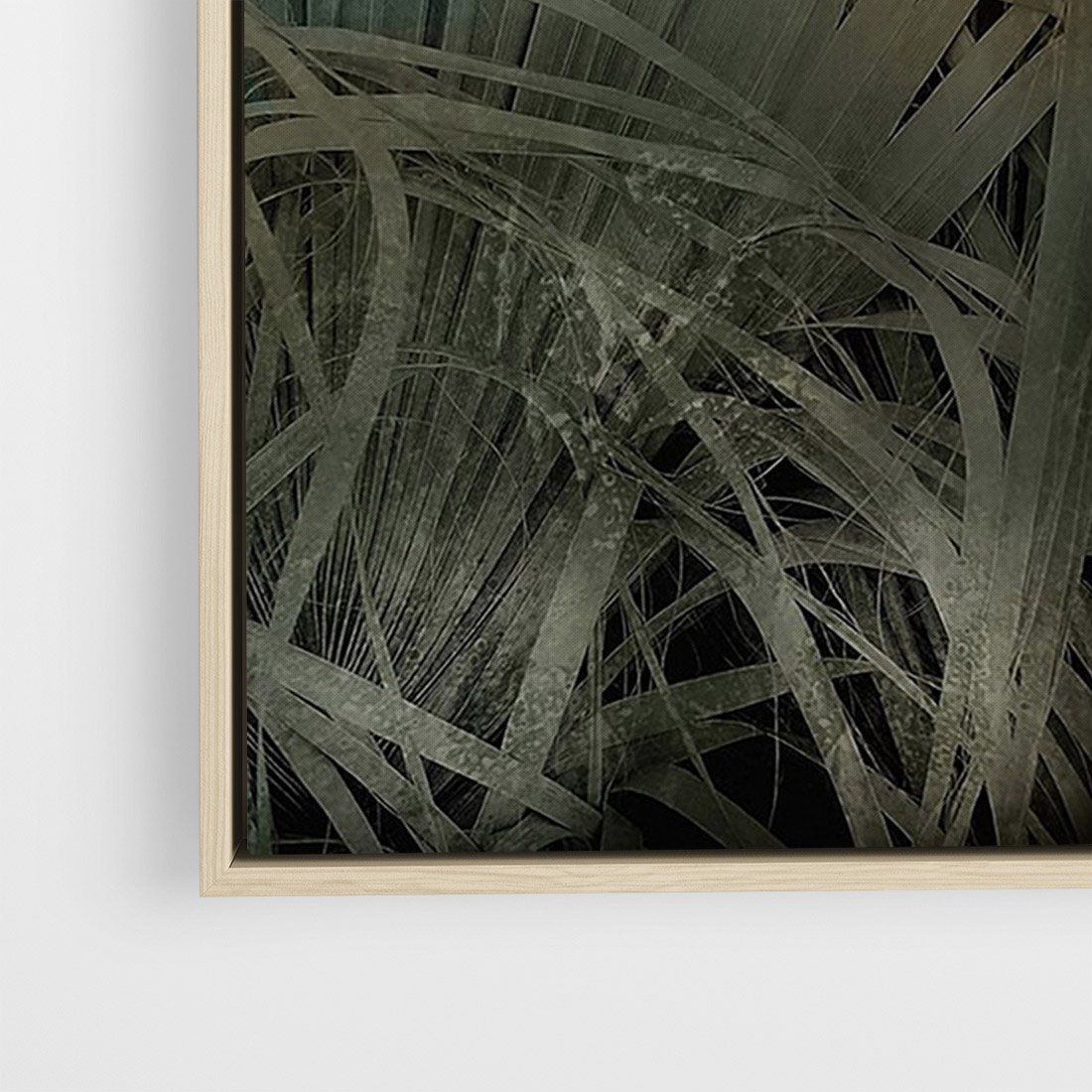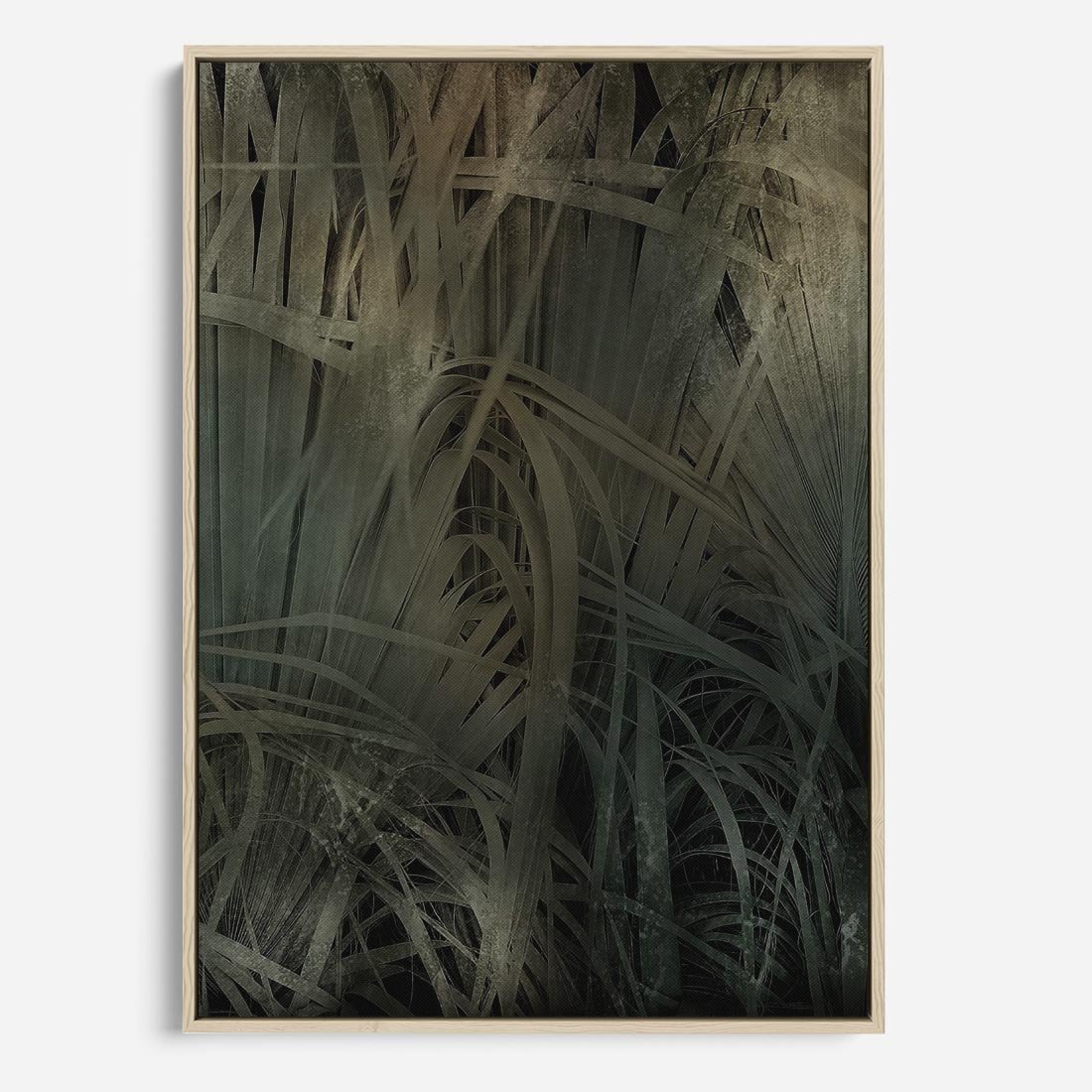 Obraz w ramie 80x120 - Światło w mroku duszy - liście traw, mroczny klimat - rama drewno
