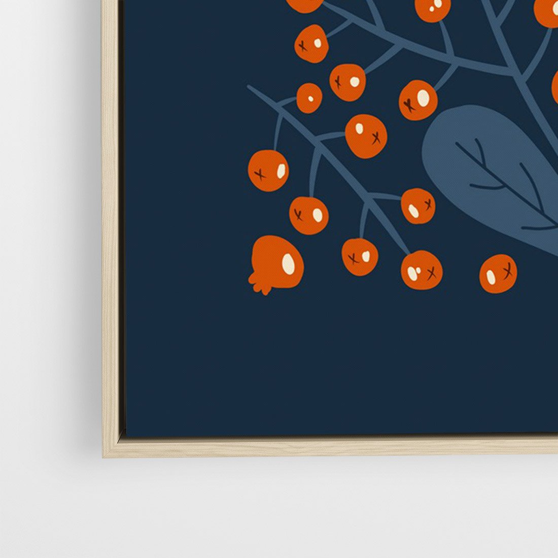 Na granatowym tle wyraziste pomarańczowe owoce jarzębiny tworzą dynamiczną roślinną kompozycję. To harmonijne połączenie barw, które oddaje piękno i zróżnicowanie natury. To obraz, który przykuwa uwagę i wyróżnia się oryginalnym zestawieniem kolorów i form roślinnych.