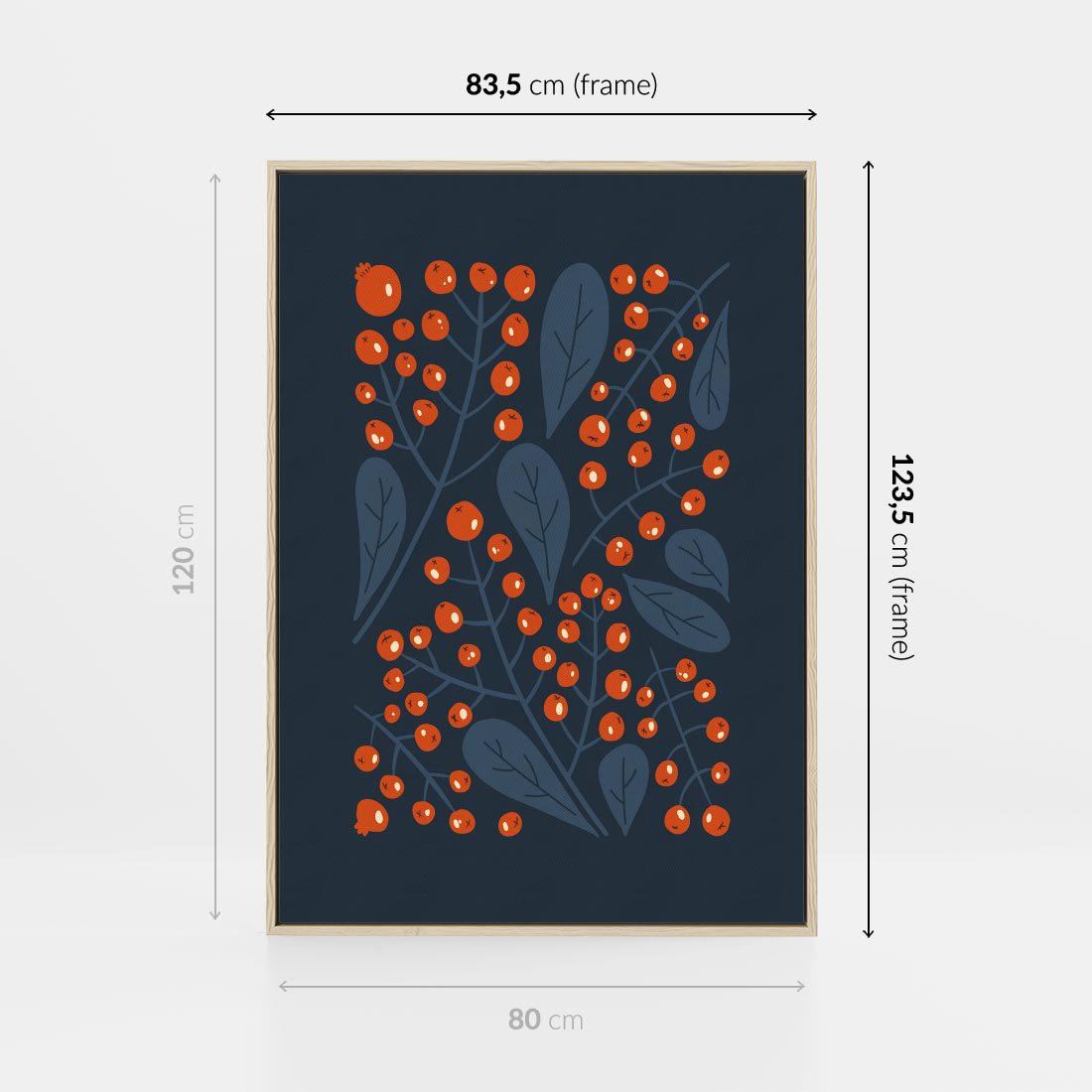 Obraz w ramie 80x120 - Symfonia liści i owoców - granatowe tło, pomarańczowe owoce jarzębiny - rama drewno
