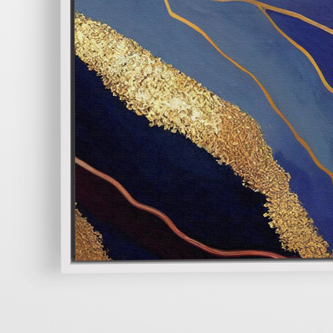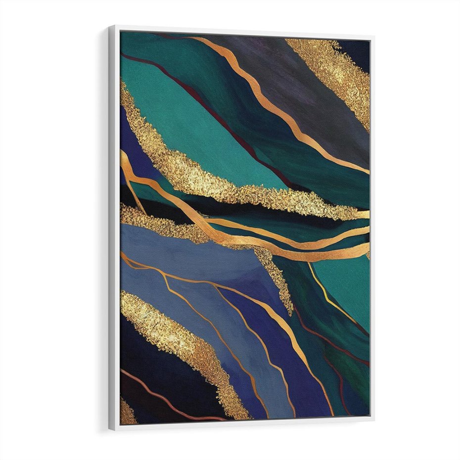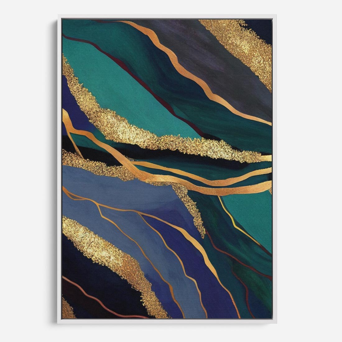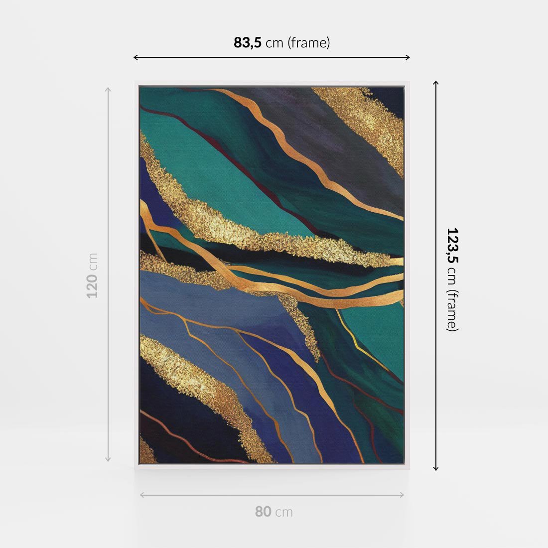 Zachwycaj się abstrakcyjną grafiką inspirowaną marmurem, wzbogaconą o intensywne kolory złota, zieleni i granatu. To wyjątkowe dzieło sztuki, stworzone dla osób ceniących elegancję i nowoczesność. Obraz emanuje luksusowym wdziękiem i będzie doskonałą dekoracją dla miłośników sztuki, pragnących unikalnego akcentu w swoich wnętrzach.