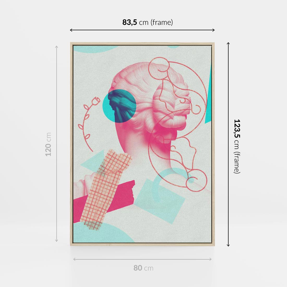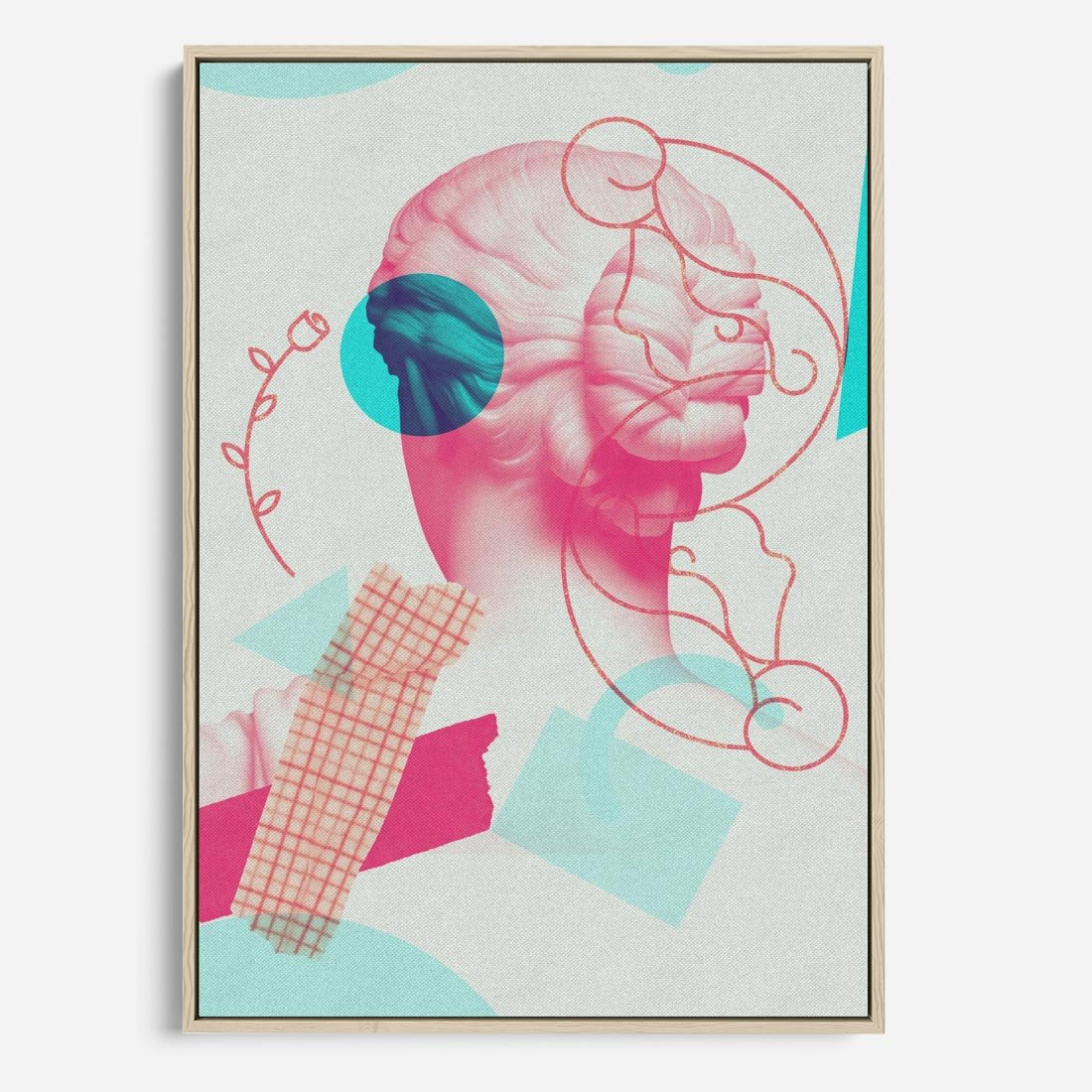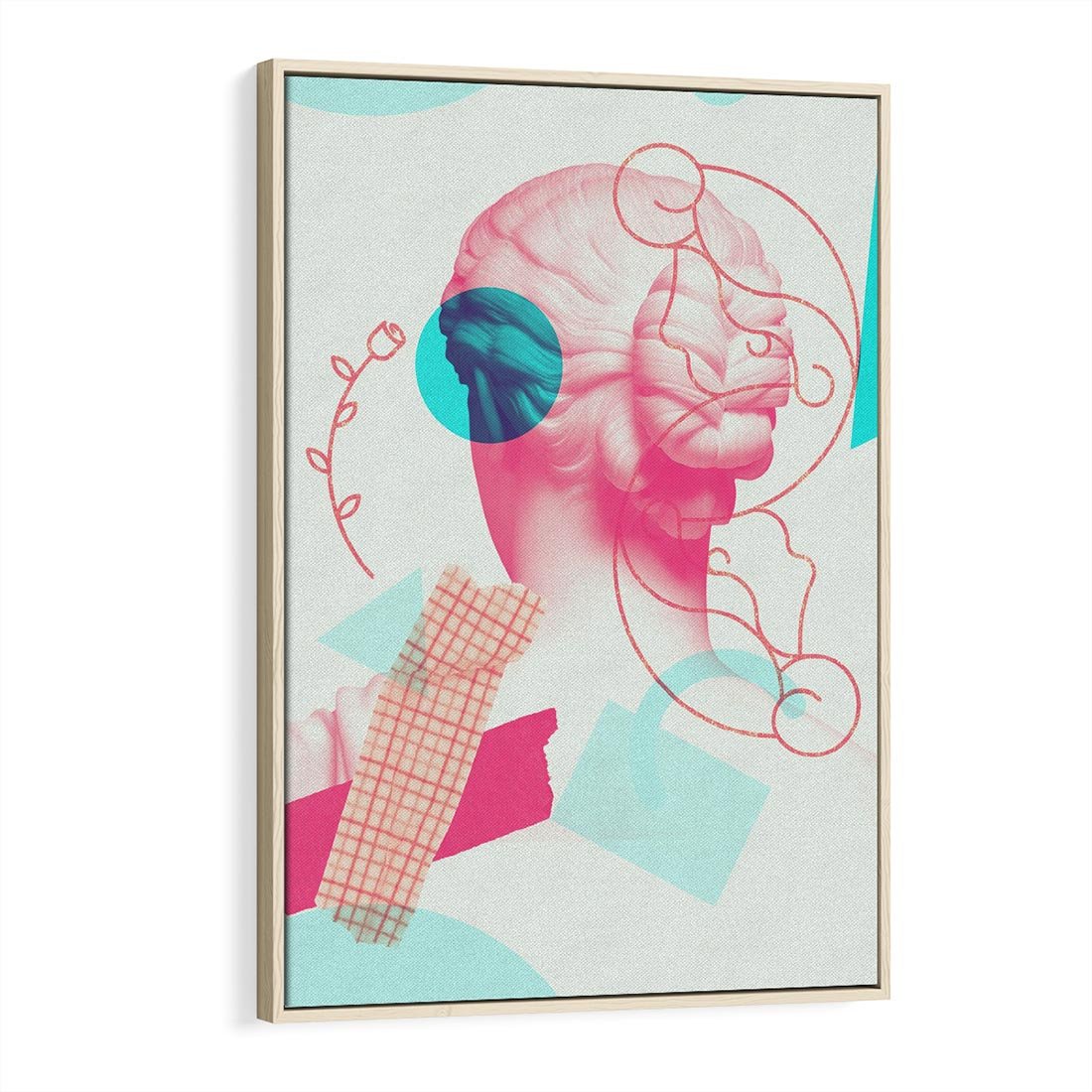 Ten nowoczesny kolaż łączy antyczną rzeźbę kobiety z elementami sztuki współczesnej. W delikatnych odcieniach różowego ukazuje piękno ludzkiej formy, przenosząc je w nowoczesny kontekst. To unikalne dzieło sztuki przyciąga wzrok i inspiruje do refleksji nad pięknem i ewolucją sztuki przez wieki.