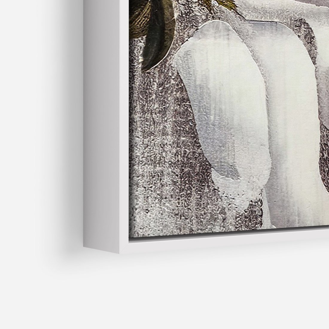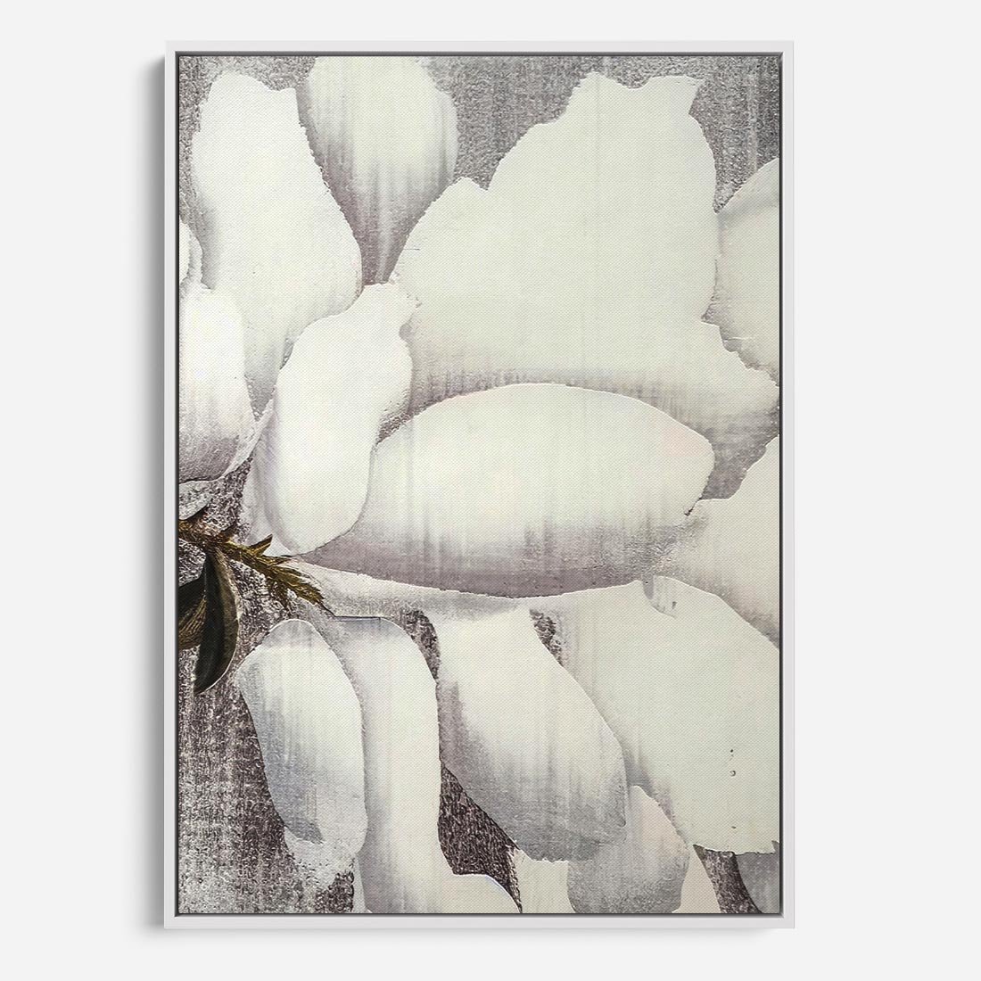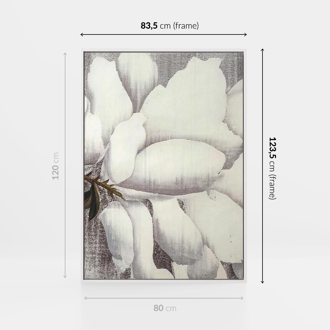 Ten wyjątkowy obraz na płótnie prezentuje białe kwiaty o dużych płatkach, ukazane na delikatnym szarym tle. Kanwa, na której malowano ten kwiatowy motyw, dodaje tekstury i głębi dziełu, nadając mu unikalnego charakteru. To elegancka dekoracja, która wzbogaci Twoje wnętrze o subtelny akcent natury i estetyki.