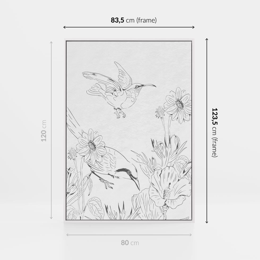 Obraz w ramie 80x120 - Tropiki w Monochromie - czarno biały szkic, tropikalne ptaki - rama biała